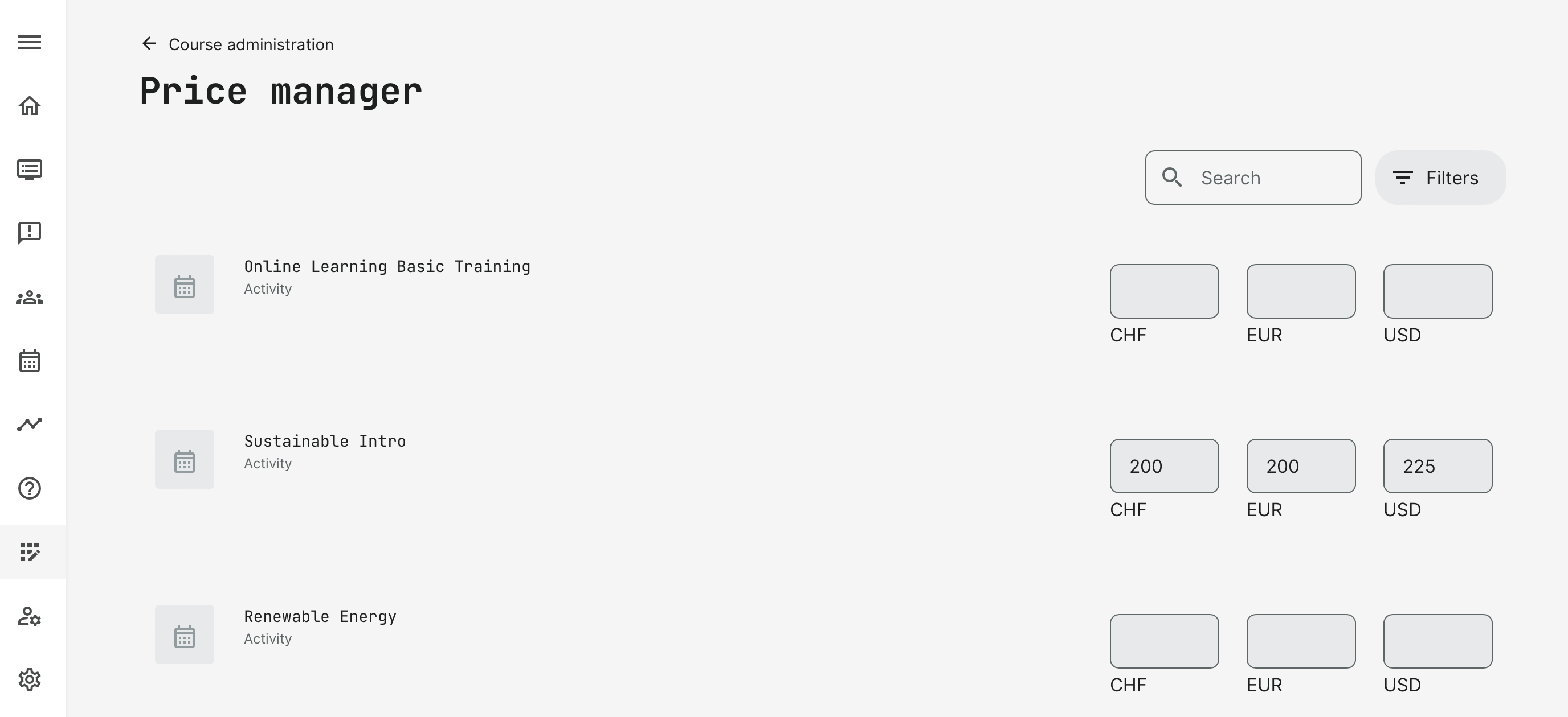 The purpose of the Price Manager is to make it easier to manage prices across a larger number of training activities and especially if multiple currencies are involved. Search and filters help focus the list: