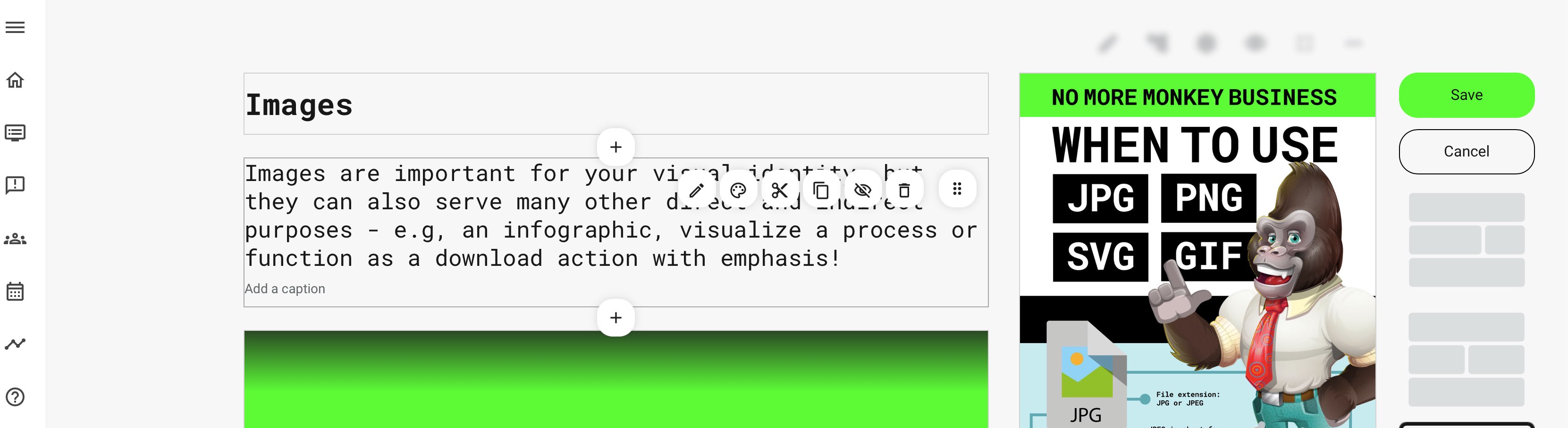 Once you click the Plus icon, a carefully selected set of tools will allow you to insert or create new content at the position you have chosen. Each of these options are described separately.