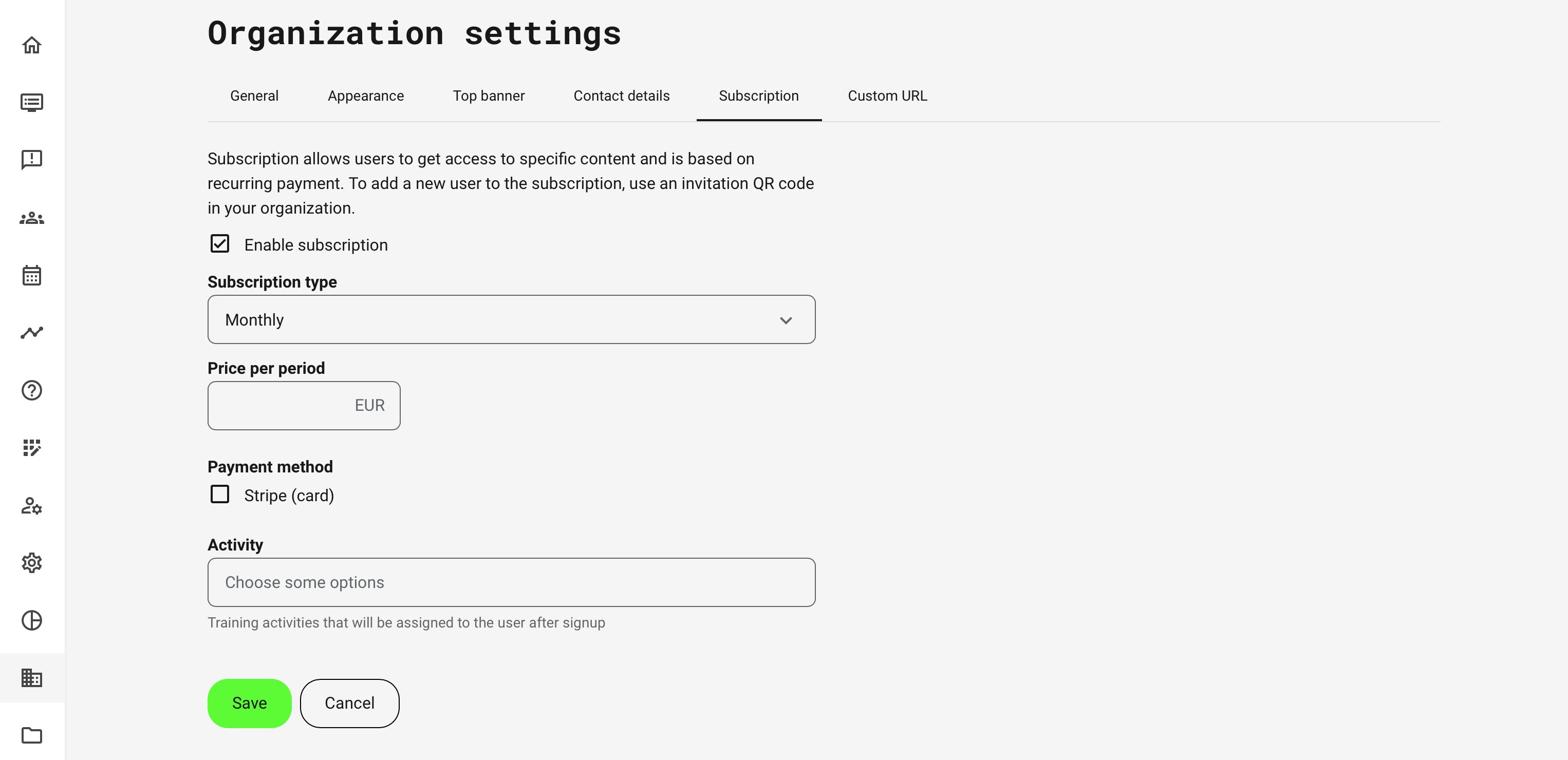 To set up a subscription model you need to have a Stripe account and configured this payment method in the commerce section of the platform.