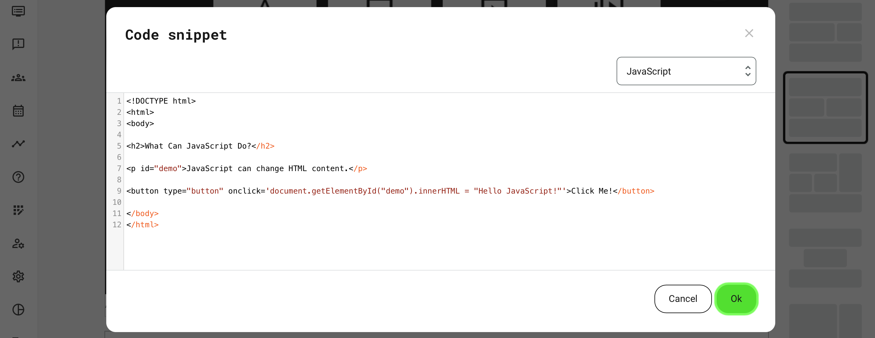 Insert formatted code snippets directly on course pages, supporting 40+ languages with responsive display and easy copy-paste — no need for static images or external tools.