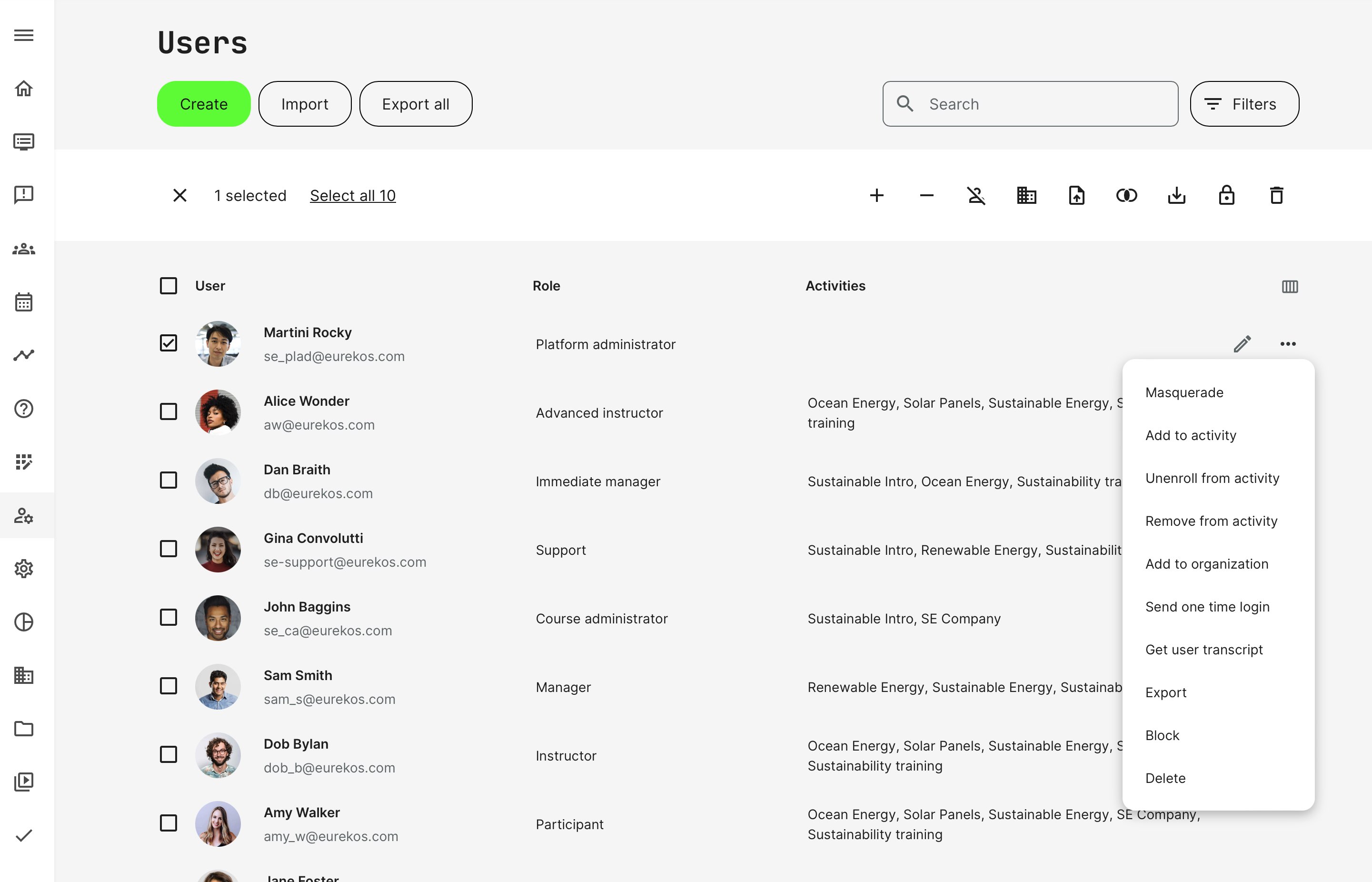 Select multiple users at the same time to apply bulk operations - e.g., give two users access to several training activities in just one operation or export just a selection of users. Again, based on arbitrary filters and results.
