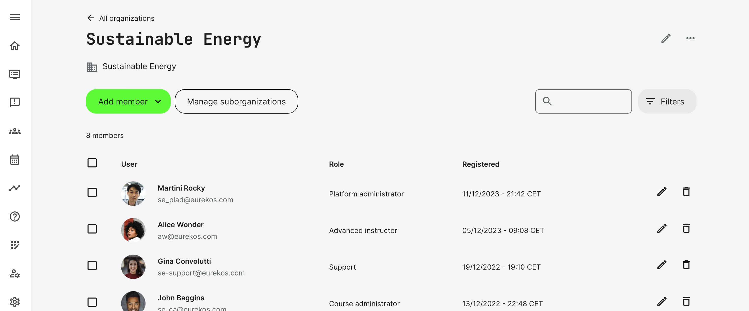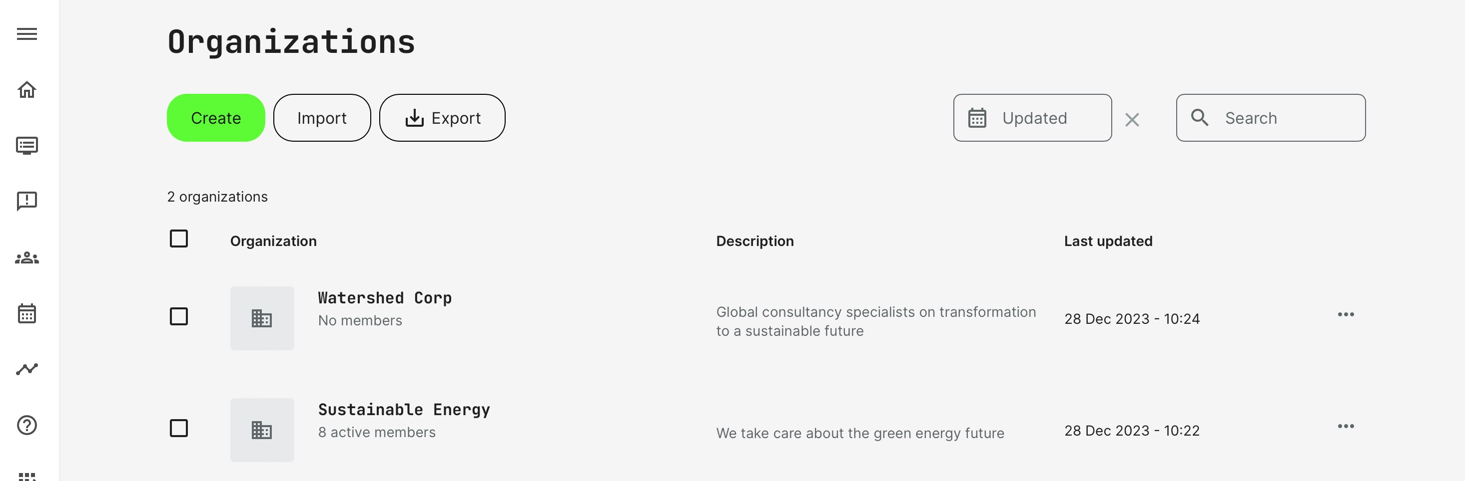 Organizations is a section of the main menu, which is available exclusively for Platform Administrators and Global Administrators. The list includes basic information, such as title, description and number of members.