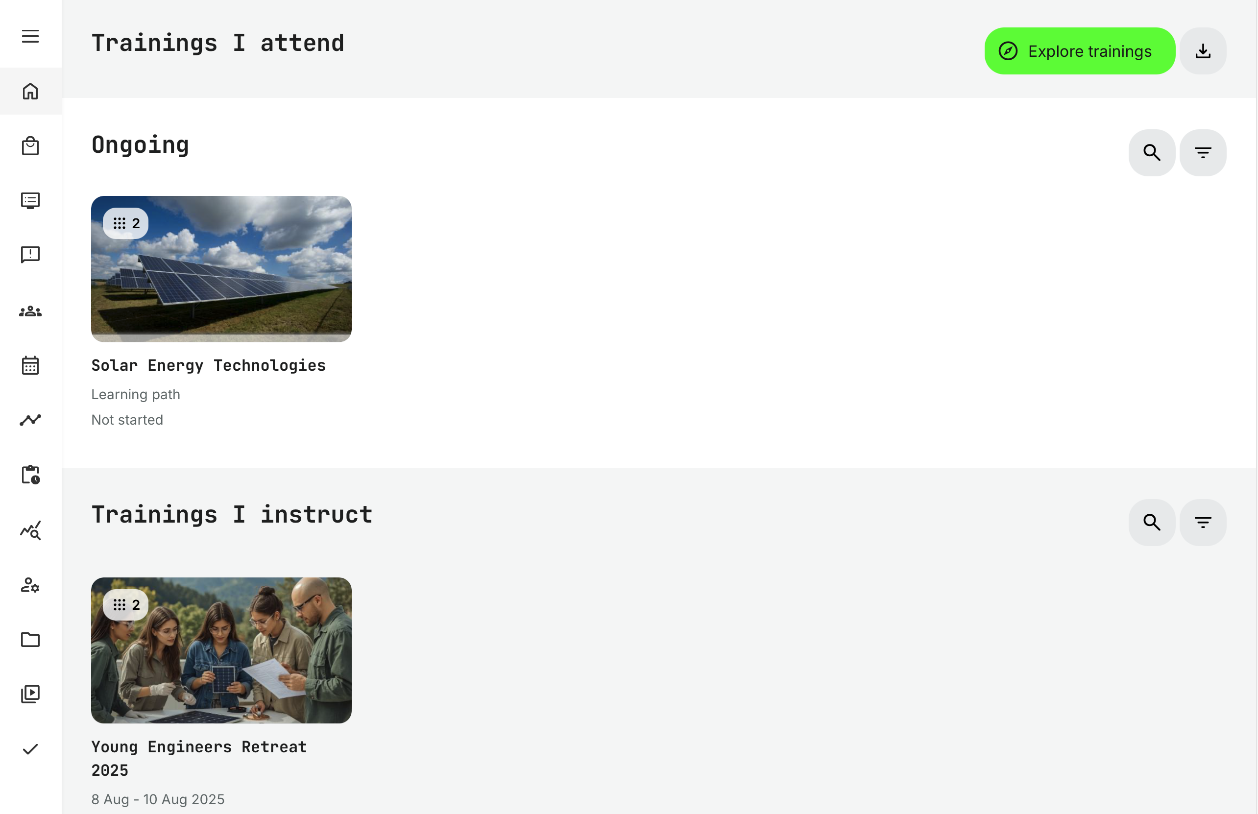 - Search and Filters enable quick browsing of ongoing training activities