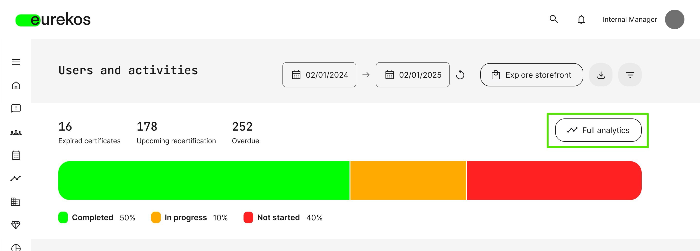 For Immediate Managers wanting to see more in-depth data on individual participant training performance, clicking the [Full Analytics] button will allow them to explore analytics they have been permitted to access by a Platform Administrator (Settings → Analytics permissions):