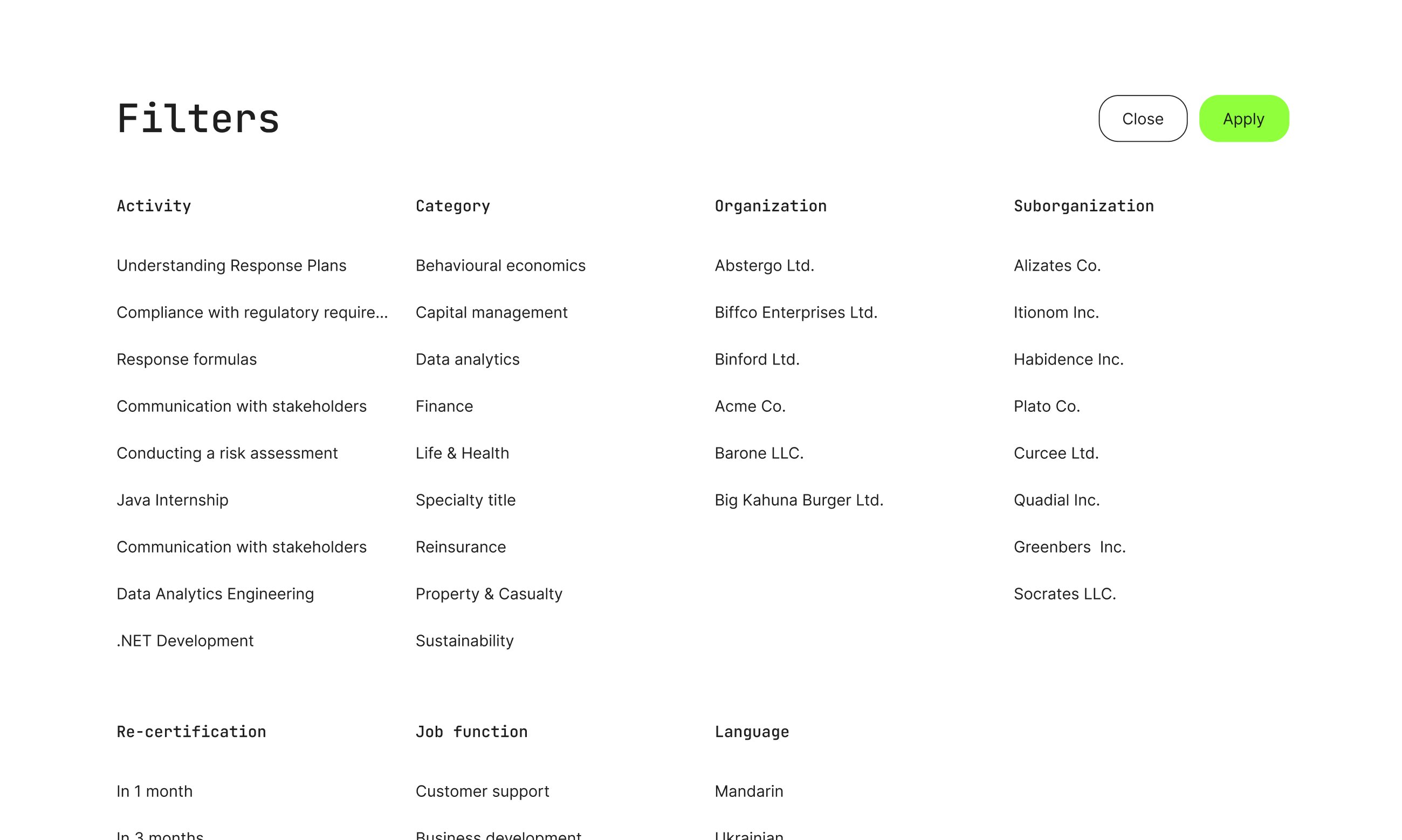 - Job Function: Filter by the job title- or department tags assigned to trainings