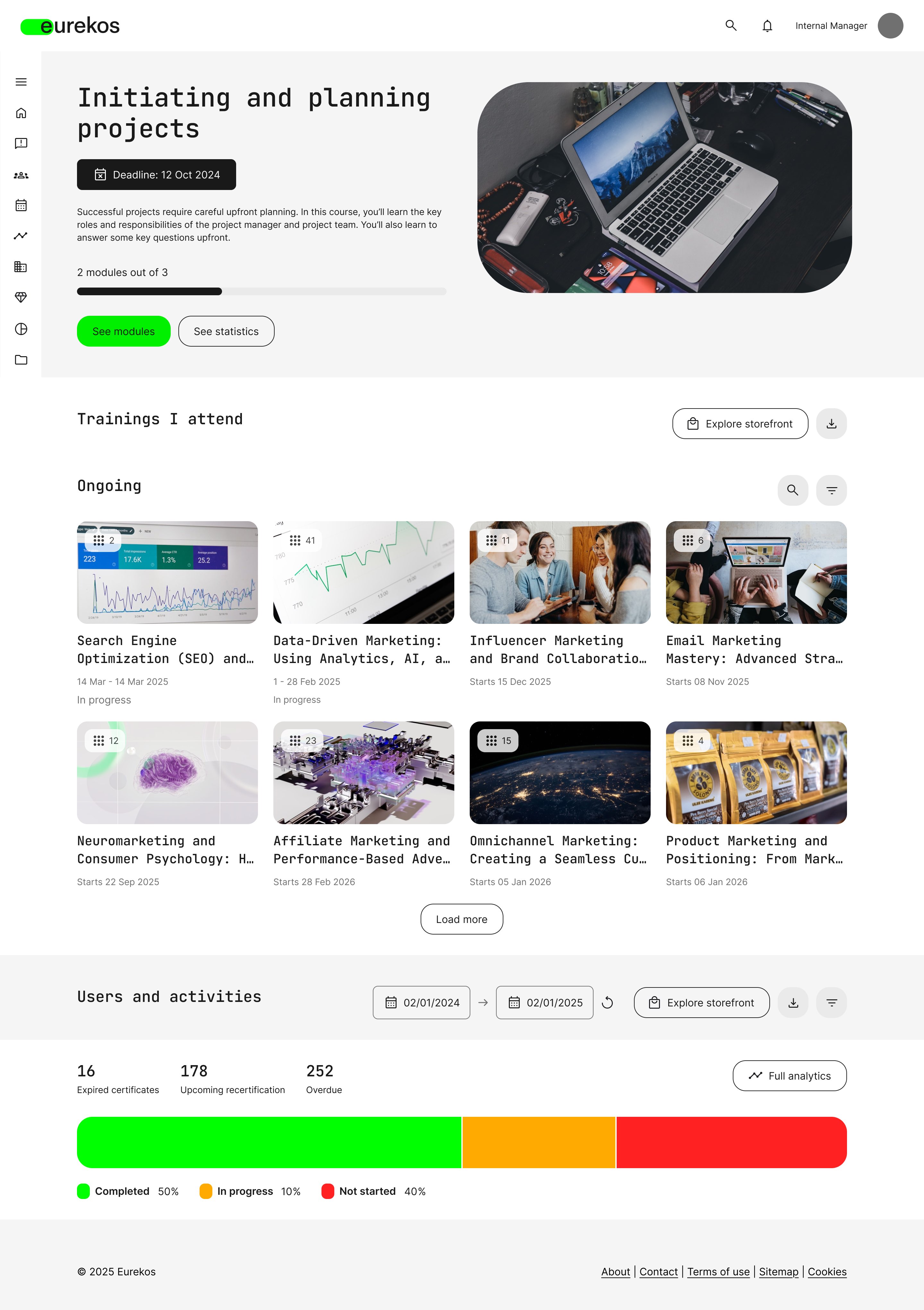 The Immediate Manager Home Screen will appear similar to that of a regular participant at first glance. As such, it will be headed by a top tile featuring the user’s most relevant current or future training, followed by rows populated with trainin grouped by the same logic as other participants. If you wish to explore this training focused layout further, please visit our Participant Home Screen article to learn more.