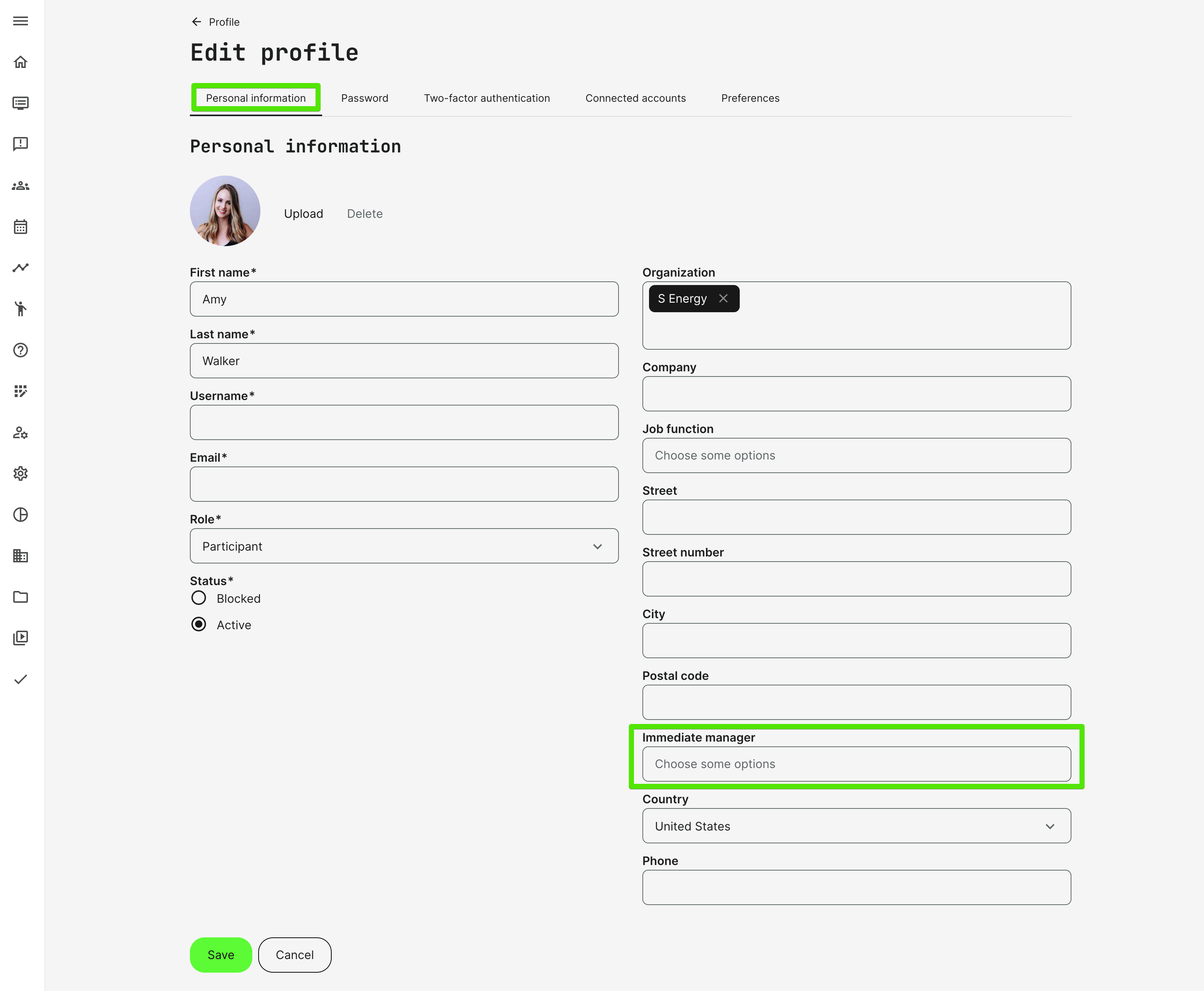 To assign a user as the Immediate Manager of another user who reports to them as a relation attribute, go to the “Personal Information” tab in the profile of the latter (Users → Edit Profile → Personal Information). In the right-hand column of fields, you are able to select one or more Immediate Manager(s) that this user is reporting directly to, then press the [Save] button to proceed with your selection: