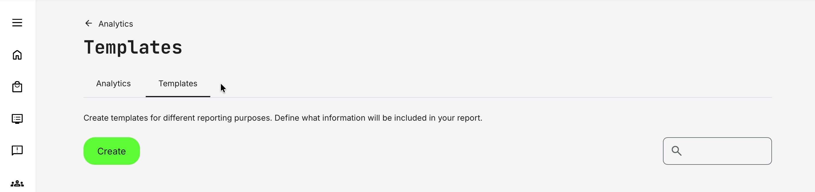 To create a report template, go to Analytics → Templates (tab) and click [Create] to get started.