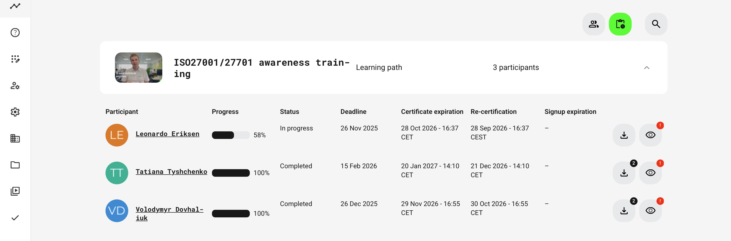 The dashboard combines progress status, certification lifecycle data, deadlines, and organizational context into a single, navigable interface. This makes it particularly valuable for: