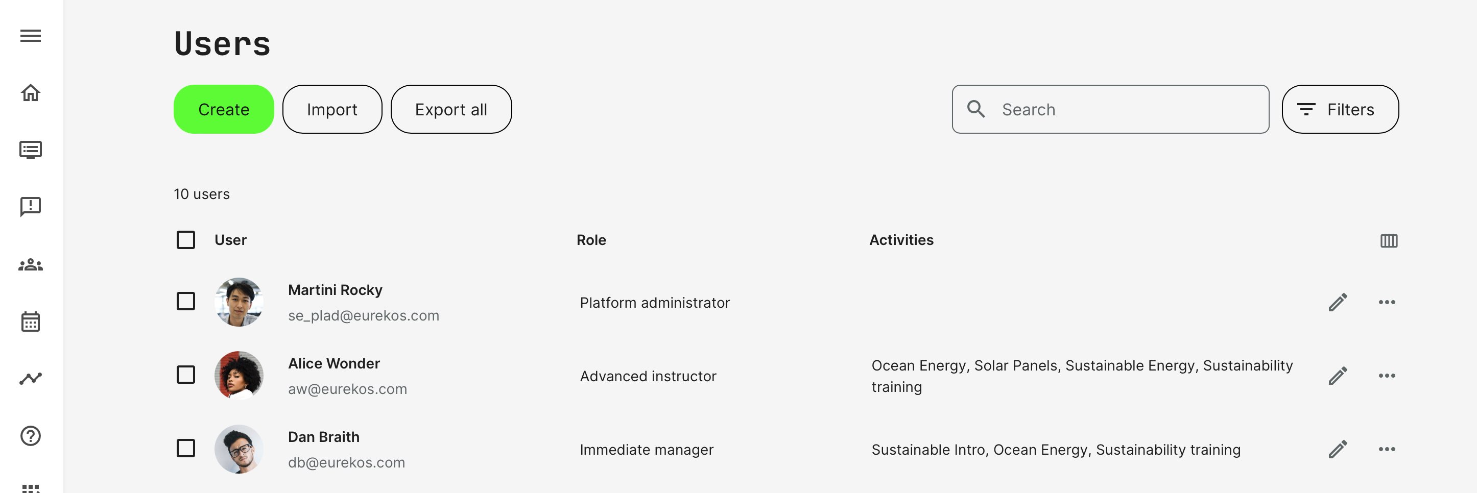 The list shows all the registered users, regardless of their relation to various courses and individual roles. They are default sorted by the date of registration with the latest being on top. Search and filters can be used find and show exactly who you need.