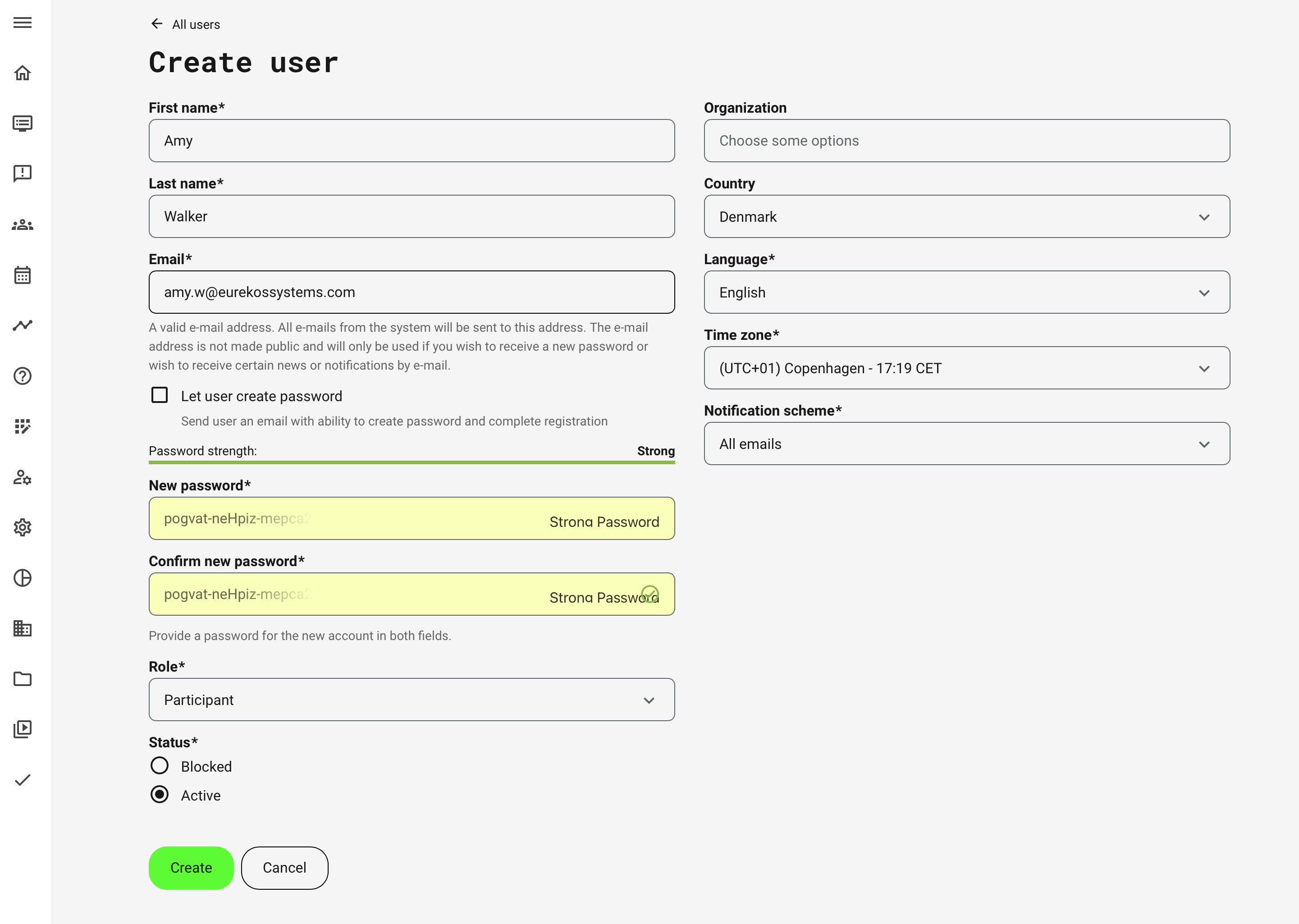 - As most users are active upon creation, this is the default choice. If you want to create a blocked user, this means they will not receive emails at all and will not be able to log in.
