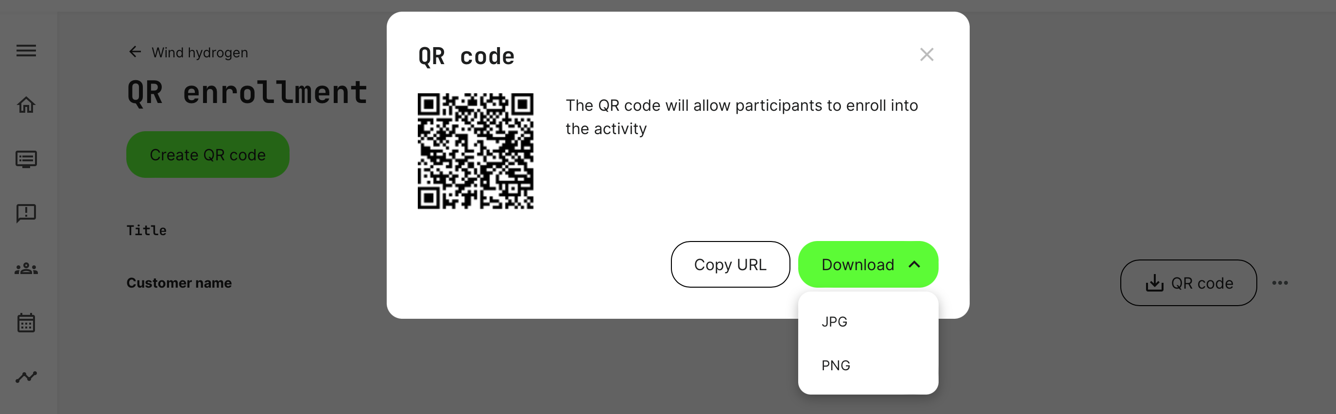 - Any number of individual QR codes/links can be created from within an activity. This way you can distribute different codes with different usage restrictions to a number of different clients and organizations.
