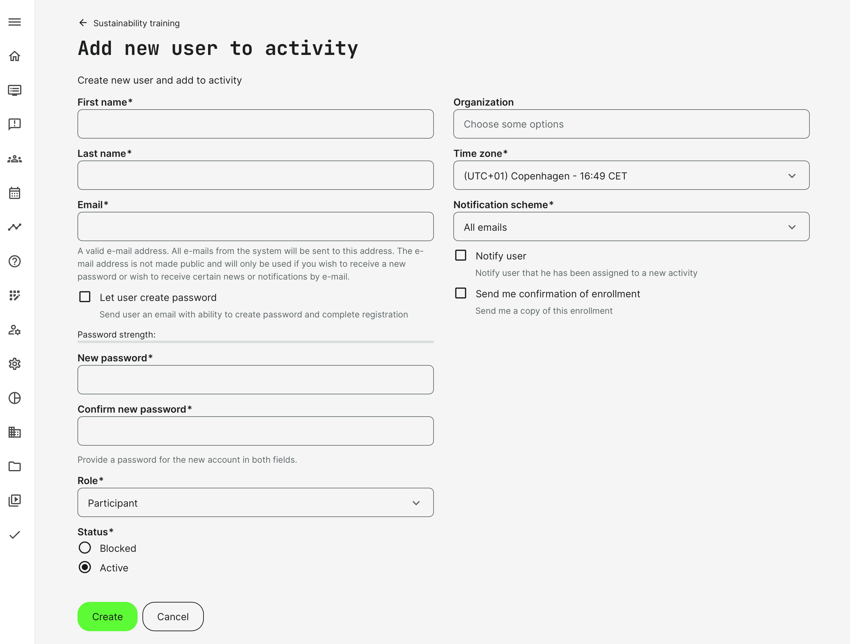 From inside the activity you can enroll participants directly by creating a new user, register the user on the platform, and enroll the same user to a specific Training Activity in a single operation.