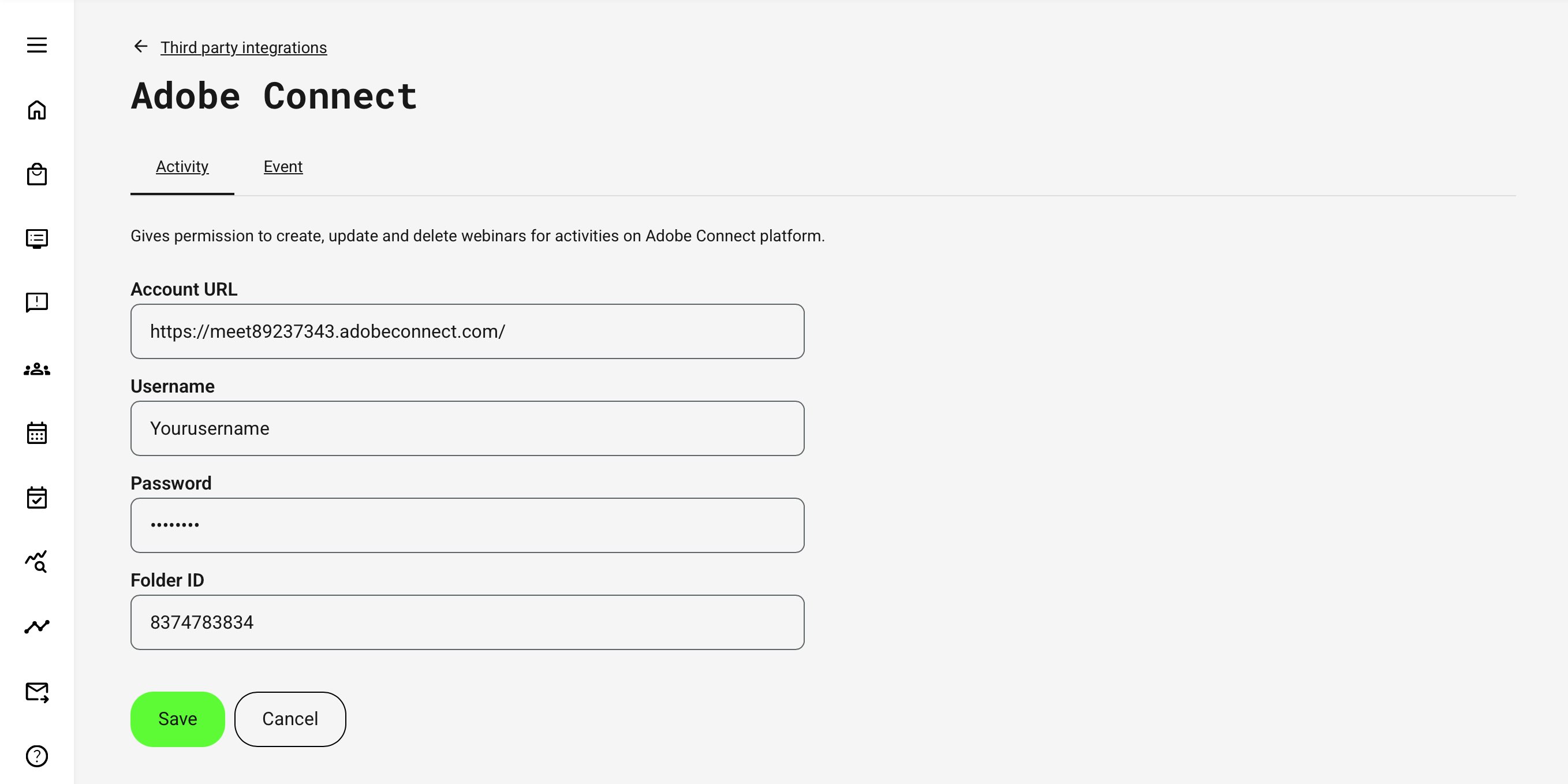 💡It is possible to configure separate Adobe Connect setups for activity-based events and calendar events, allowing you to align session management with your preference. Alternatively, you can use a single centralized folder and identical configuration for both Activity and Event, ensuring that recordings and webinars are stored and managed in one consistent location.