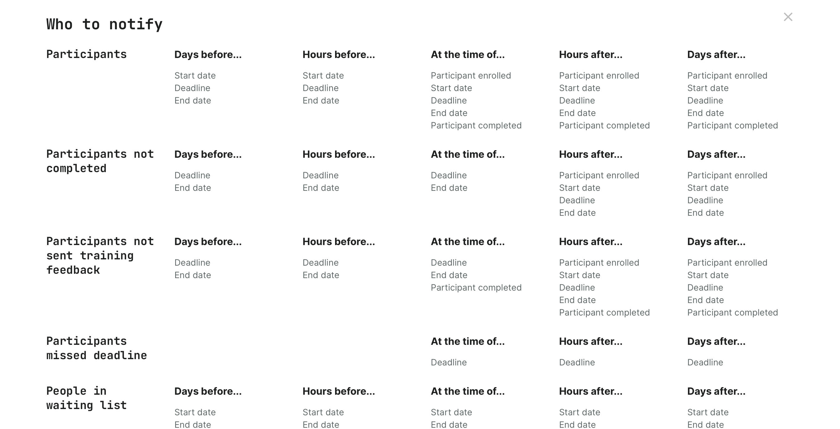 Automated email workflows are related to a training activity by sending a series of predefined emails activated by events such as “time before”, “time after”, “upon event”, “missed deadline” and so on. At the very least, this minimizes the time and effort for course management and makes it possible to potentially fully automate processes across thousands of participants.