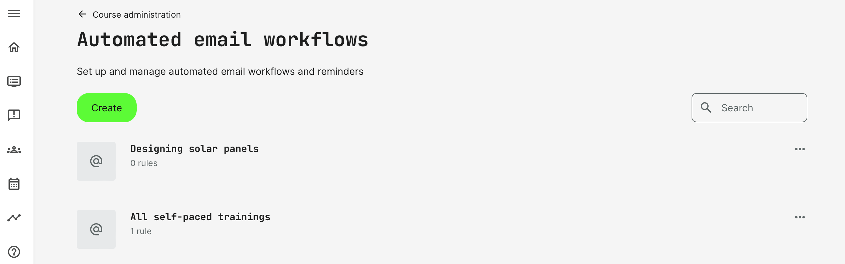 To create a new automation, Go to the Course Administration → Automated Email Workflows. Each workflows can include as many email notifications (rules) as desired.