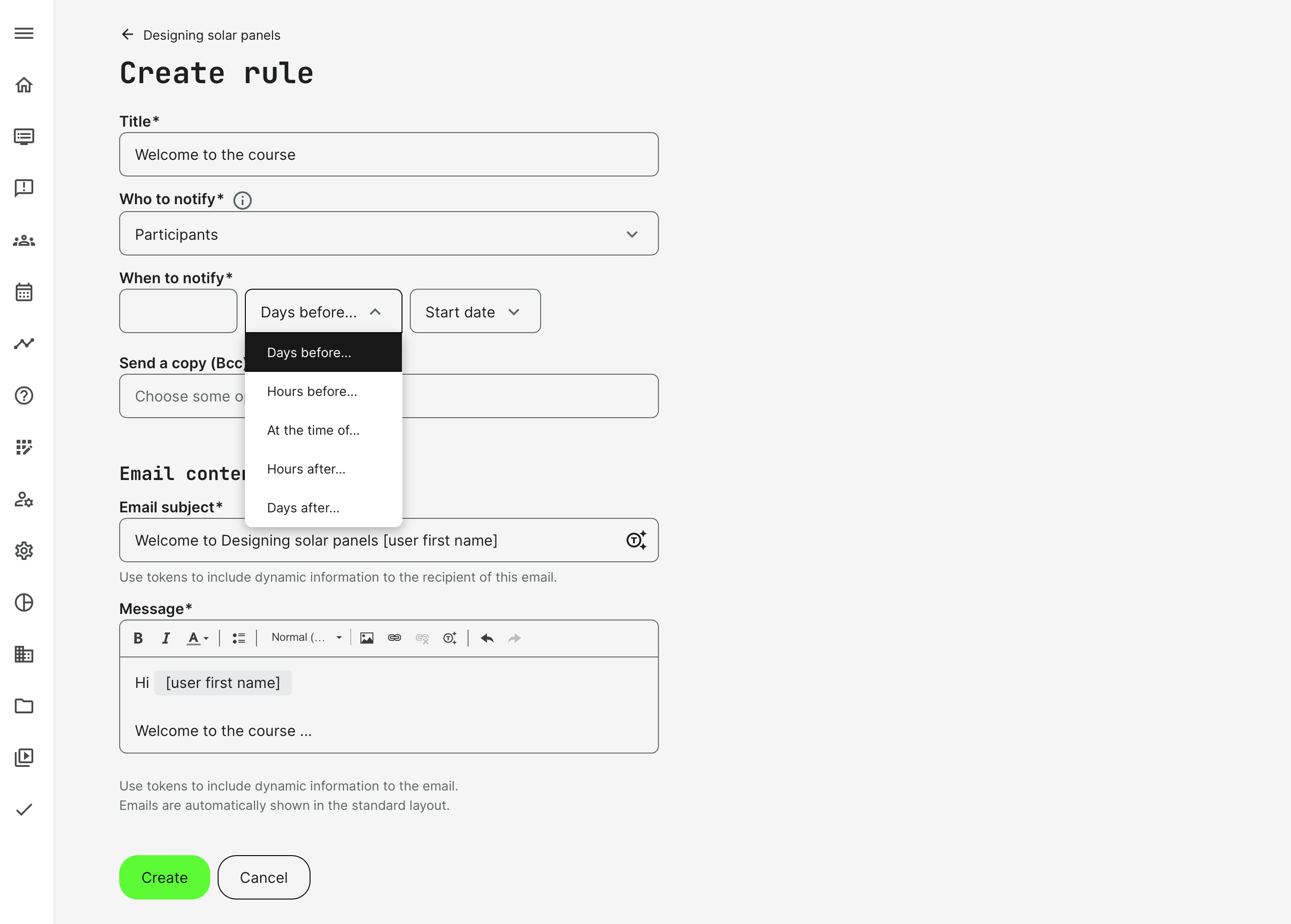 When the Who is a set to be Course Administrator, this adds a an additional field in the creation of automation rules, which represents a reminder/task list.