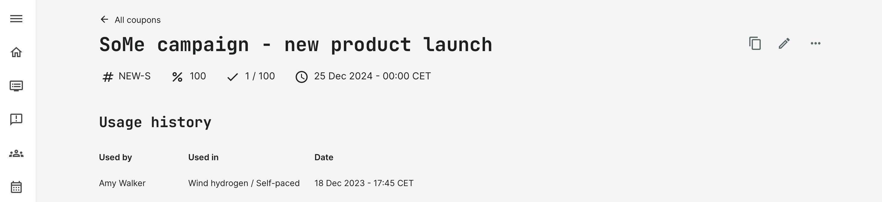 The coupons are listed for easy identification and with options to export usages from all coupons or individual coupons from the overview or the 3 dots for more.