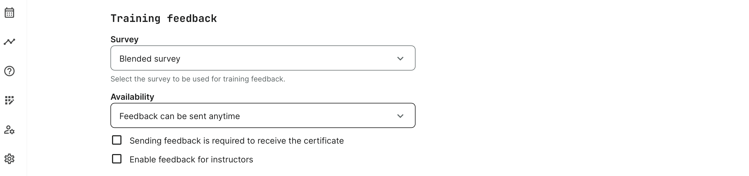 - Enable training feedback on either module or acrivity level. This depends if you have a learning path and if you want feedback at the very end, or upon completion of each training module. This can be performed on both course modules and events, virtual and in-person events on location.