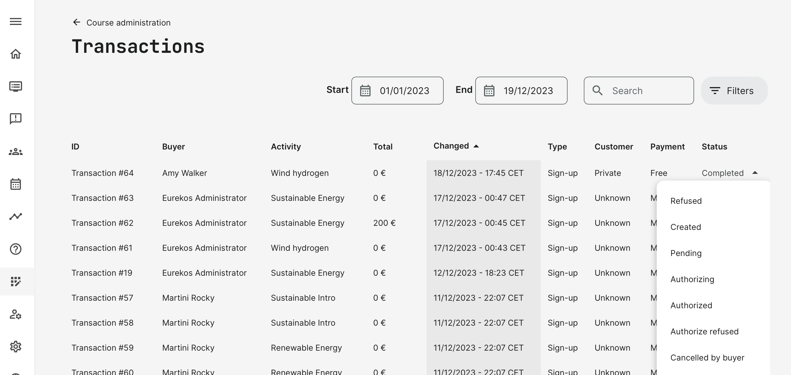 - Refused: this status is assigned to the transaction when the user’s signup in the training has been canceled by the administrator.