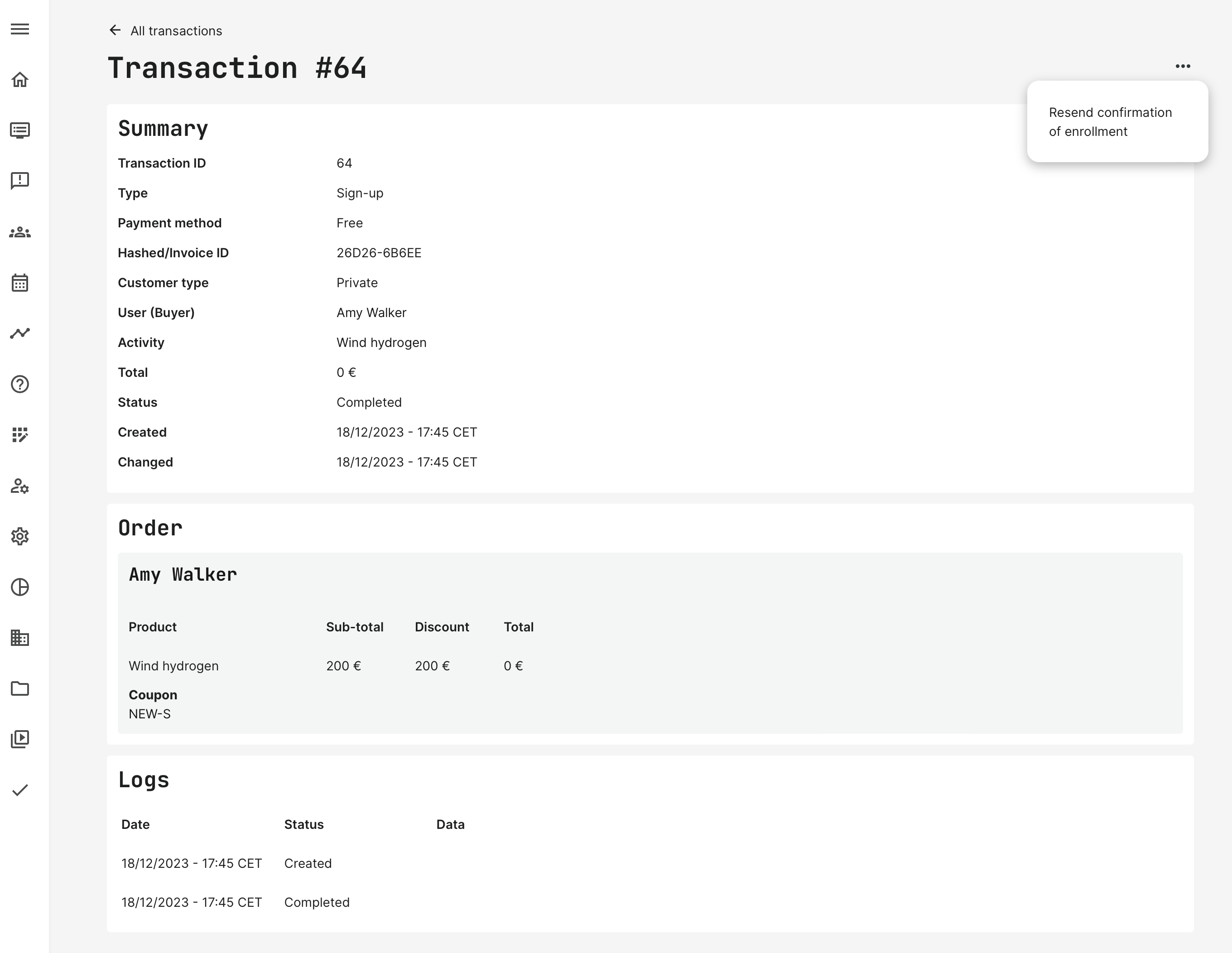 Shows all the transaction details and allows an administrator to resend the confirmation of enrollment.