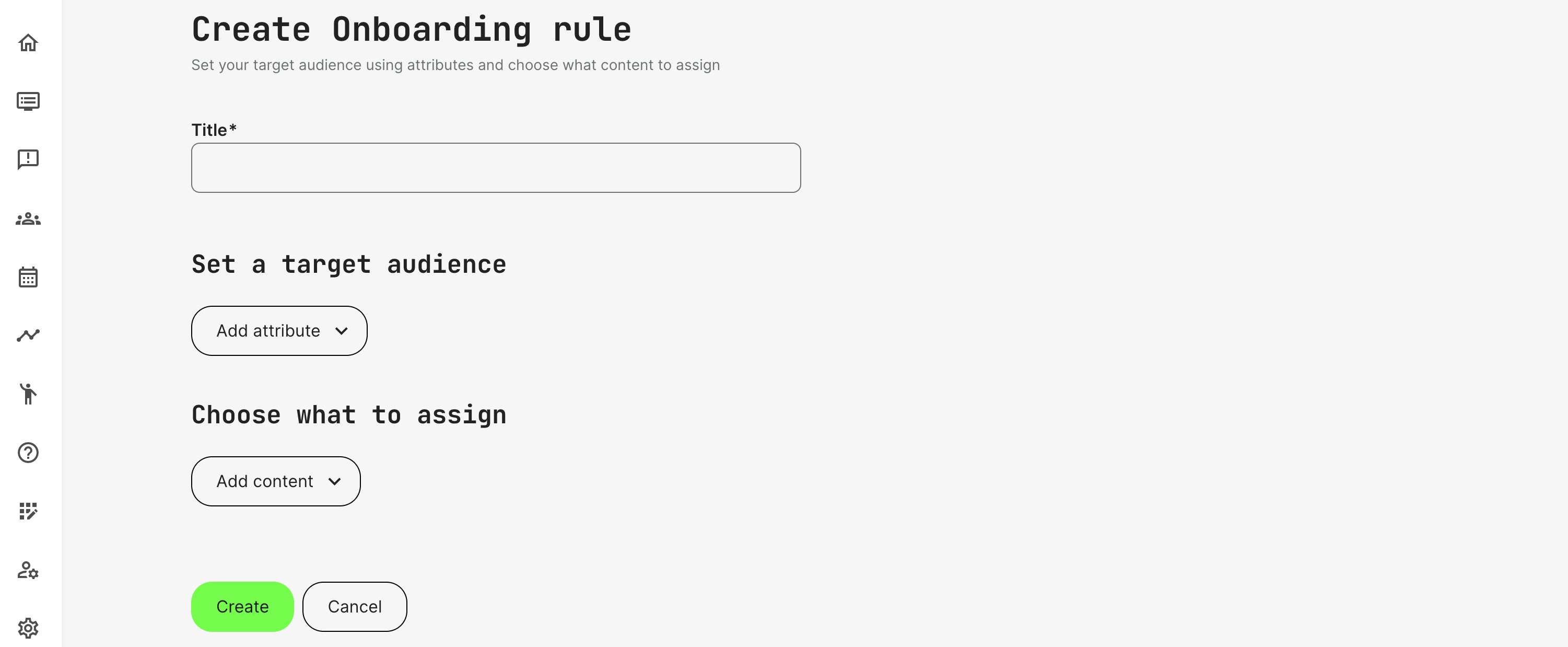 Define what to assign or enroll to the target audience you defined. This goes beyond enrolling individuals into training activities, and could instead assign membership to a Community, or trigger the pop-up of a questionnaire, video or document for the audience: