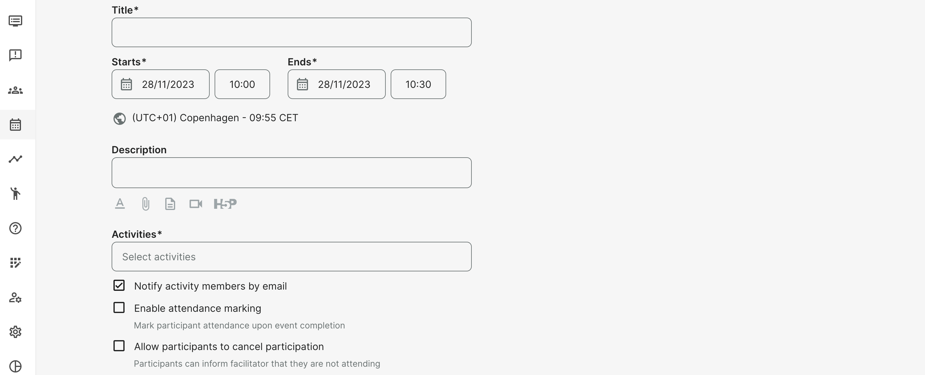 Choose an Activity or multiple activities to assign your event to. This will automatically define the participants of the event, as those will be members of the added Activity. Further options will also concern those members: