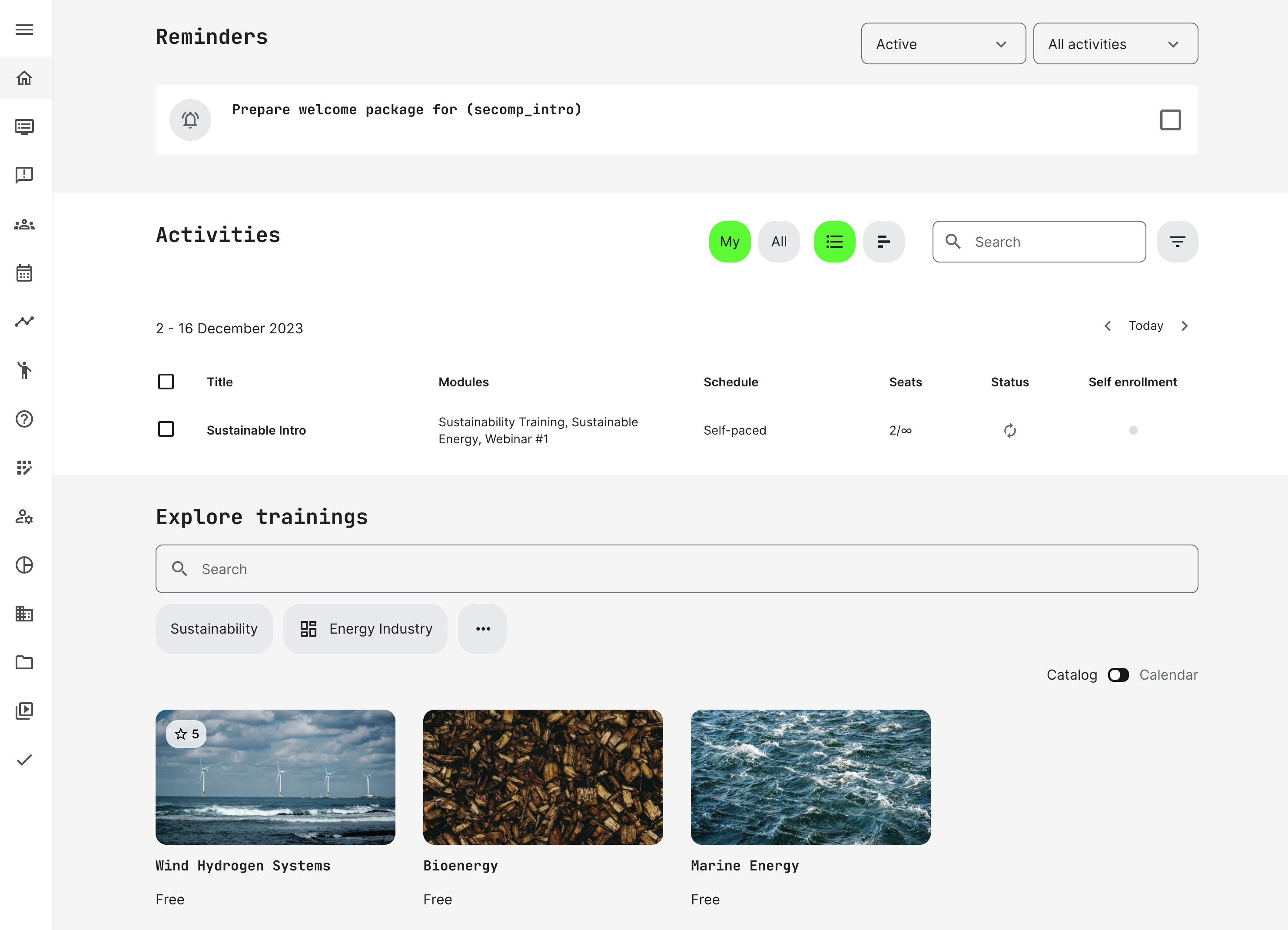 Course administrators are in charge of everything around learning delivery, supervising registrations and automations around facilitationIf you have the system role of Course Administrator, you will have a quick overview of your training activities. This will enable you to keep track of your reminders and actions, if these have been defined.
