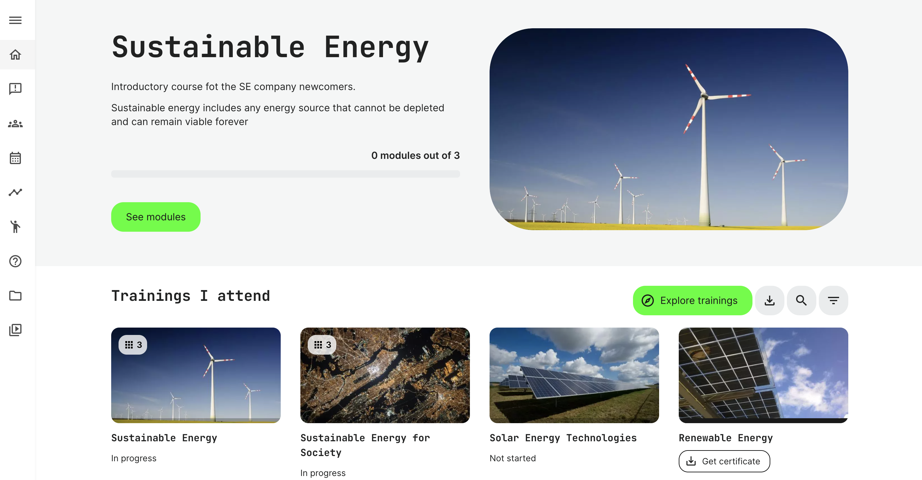 - Explore trainings shows training activities available for self enrollment. The courses can be searched by short description and title and filtered by tagging the the activity.