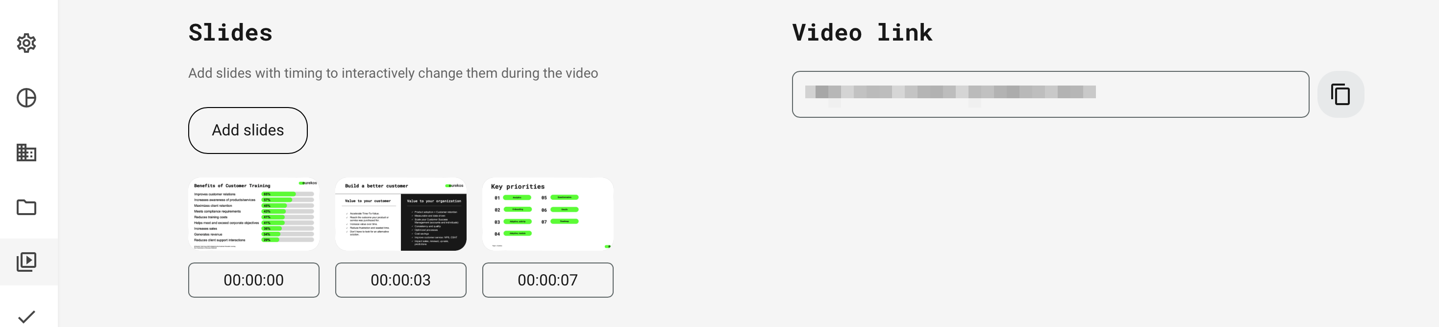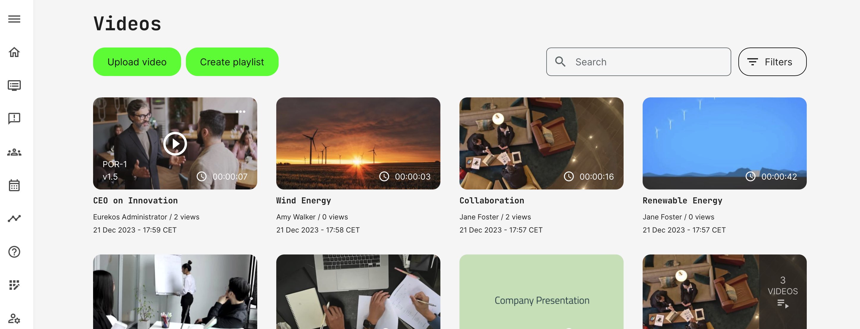 Upload and manage your videos in the video archive. This provides instant global video streaming through the native video player with subtitles and features such as playlists and the ability to insert slides with time cues. Videos are available in the main menu.