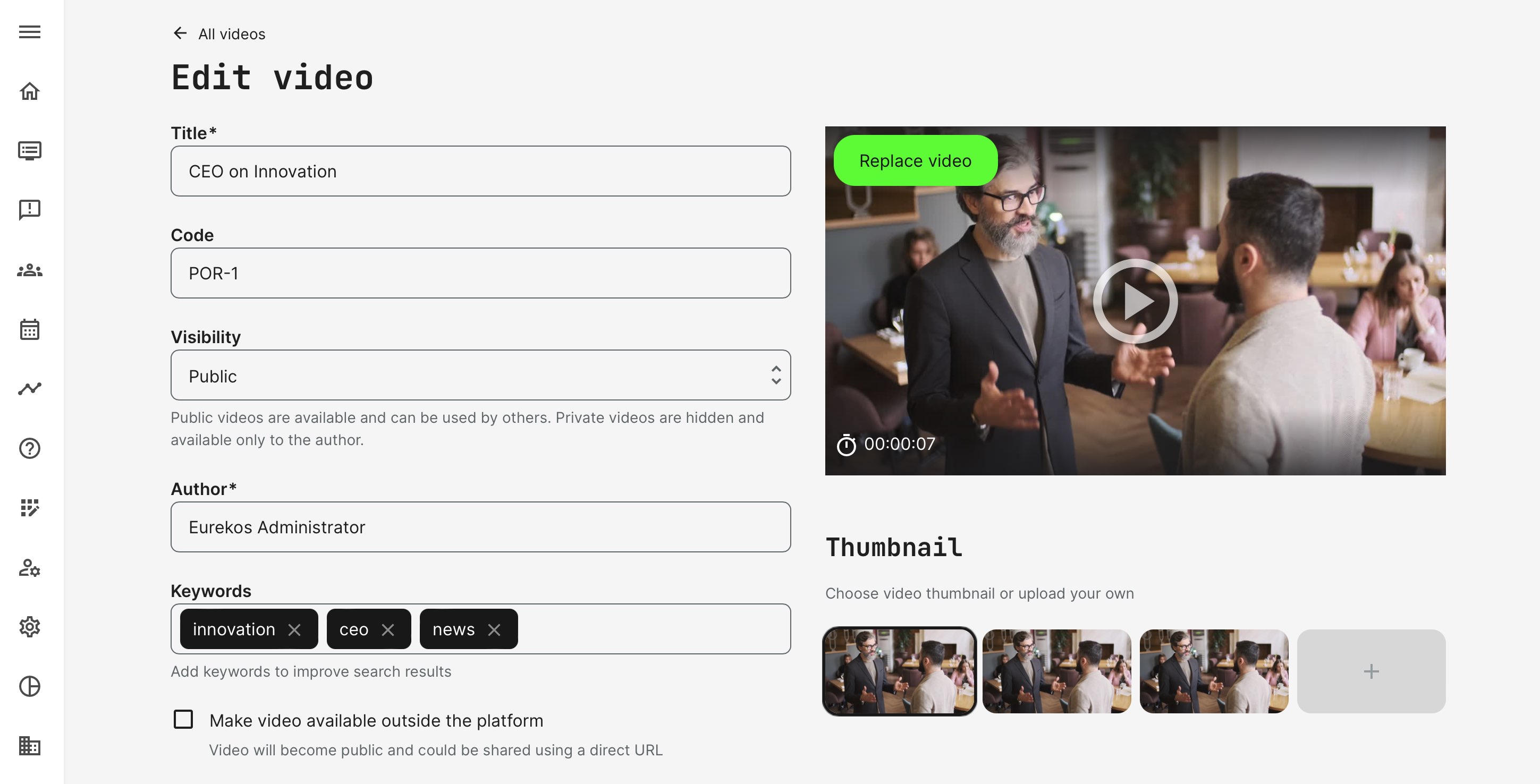 - Make this video available outside the platform will allow a link to be shared and played, even if the user is not registered and logged in.