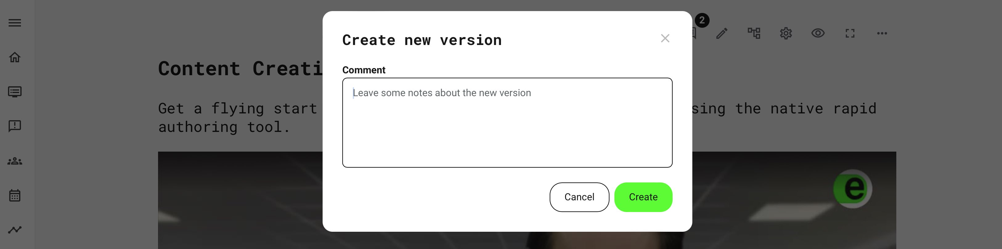 - Create new version on a SCORM/imported course, will clone the course and bring up the comment box as above, allowing you to have documentation in place.