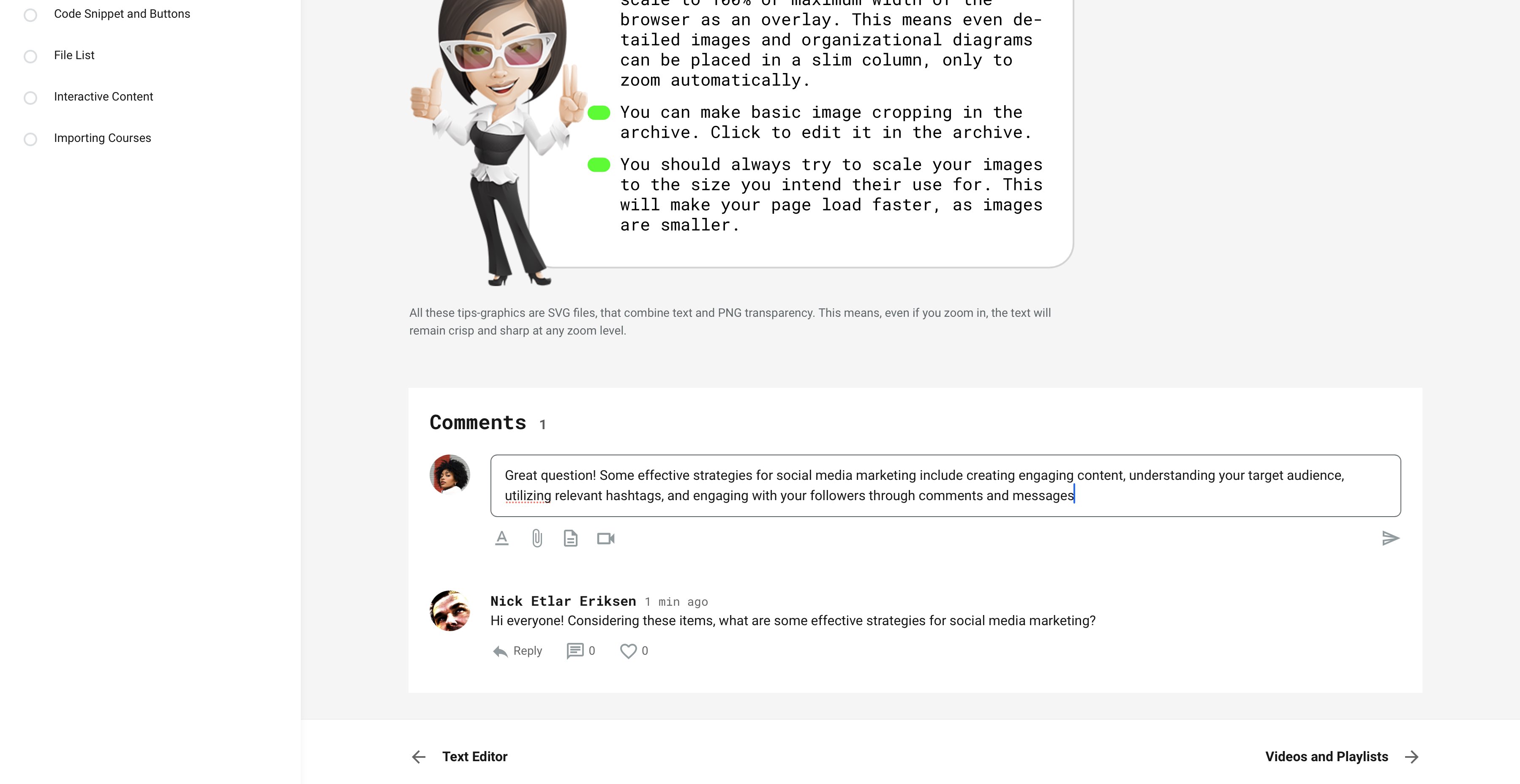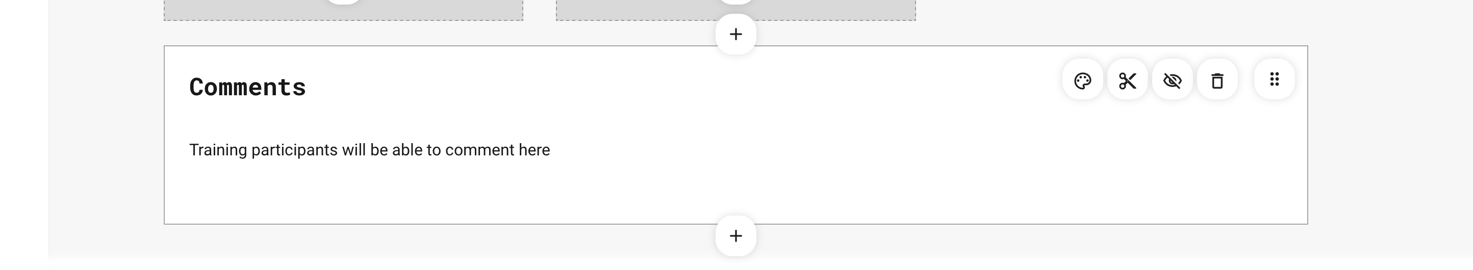 Comments allows you to create discussion threads similar to your typical "social media style feeds, and place these where you want on the course page. Once you click the Plus icon in page edit mode, you can choose to insert a Comment widget. Additional benefits: