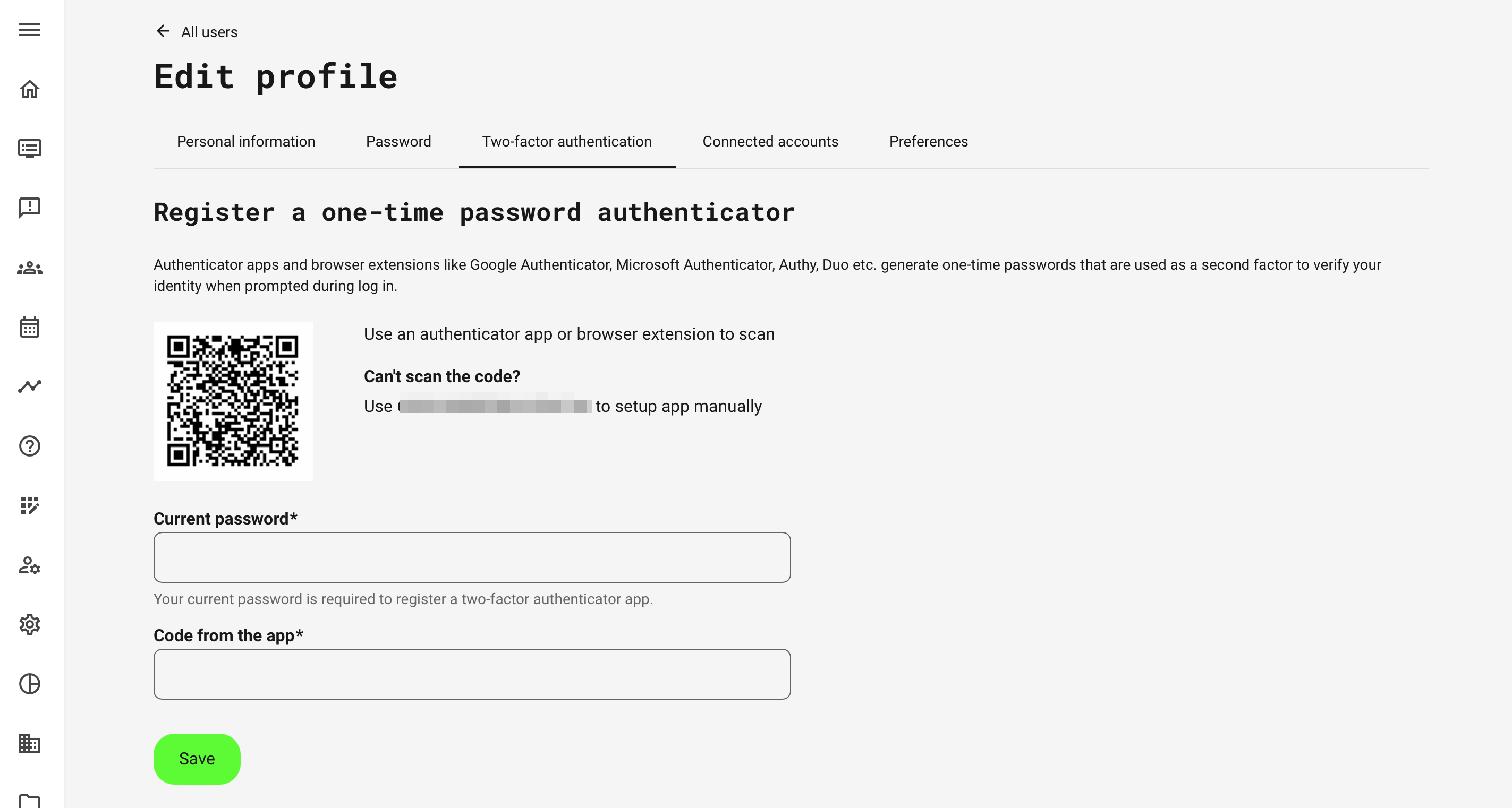 Any user can set up 2FA authentication for added security on their profile. We highly recommend using this for standard accounts with any administrator level role not already applying a SSO/2FA authentication method.