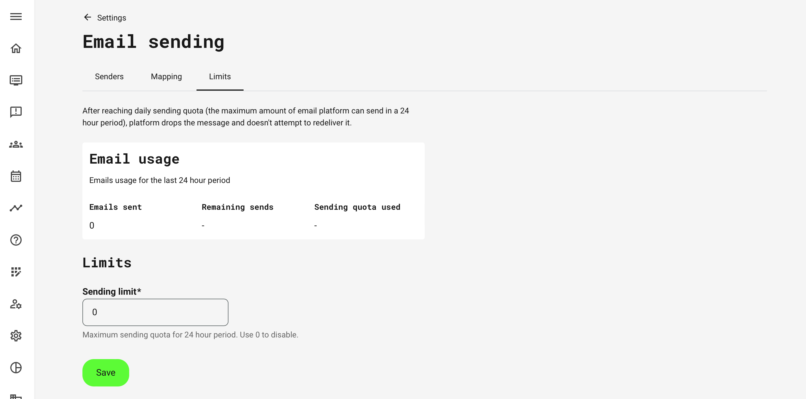 To mitigate the risk off both accidental and deliberate (malicious or technical defects) resulting in massive email sending, it is now possible to define a daily limit. Once the limit has been reached the platform will stop sending emails.
