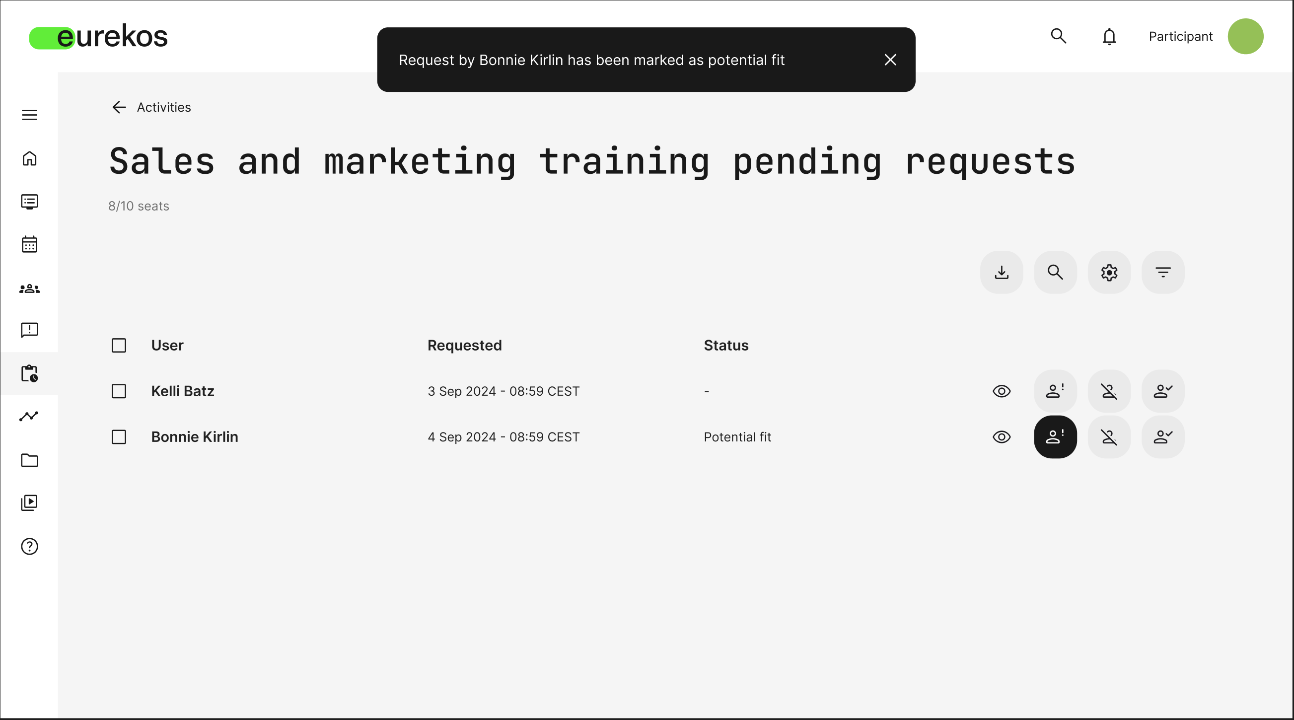 To support efficient request management, the “Potential Fit” status is integrated into the filtering system, allowing admins to quickly view all participants in this state. Additionally, bulk operations enable admins to update the status of multiple requests at once, streamlining the approval workflow.