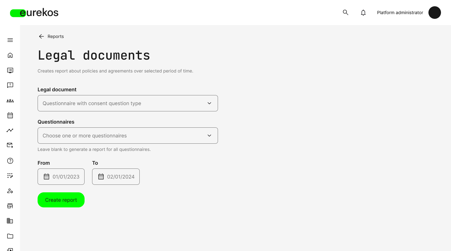 You can now generate reports based on specific timeframes and individual questionnaires containing consent questions. The downloaded report includes questionnaire titles, user data, response details, timestamps, and how the user provided their consent. Together with our introduction of the consent question type in questionnaires, these enhancements help ensure effective compliance tracking, while making it easier to manage legal agreements across the platform.