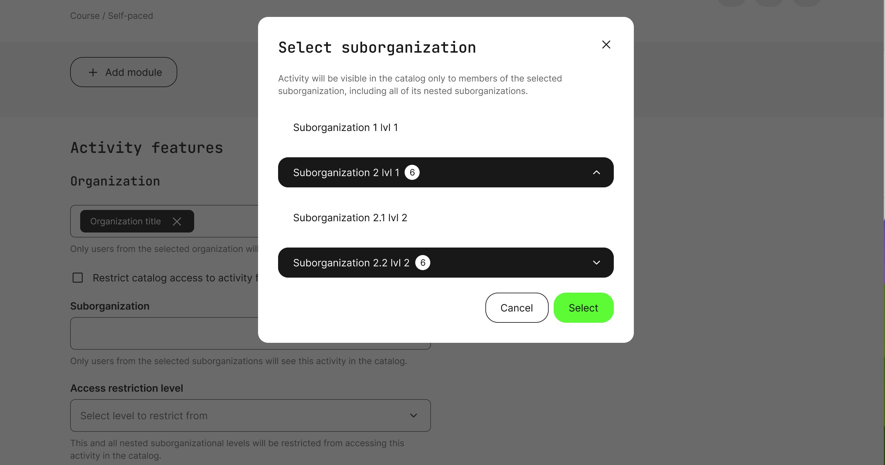 Using organizational restrictions, you can define who will see your training options for self-enrollment. Previously, this automatically included suborganizations.