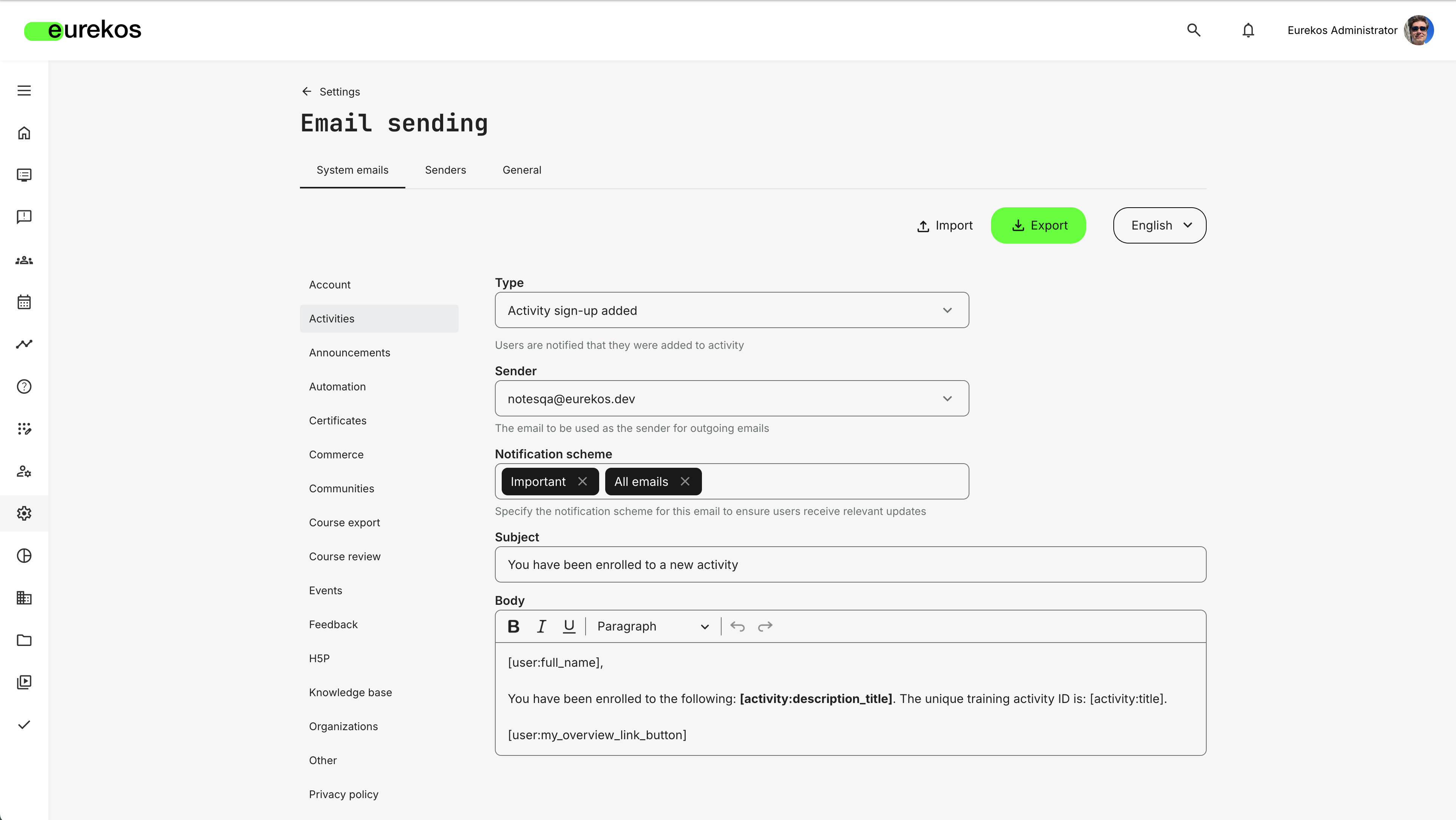 - Notification Scheme: Define which users should receive the email by selecting from the three available categories: Important, All emails, & No emails. Users are associated with one of these categories on their profile. The default category can be defined under the tab, General. To deactivate an email, remove all categories.