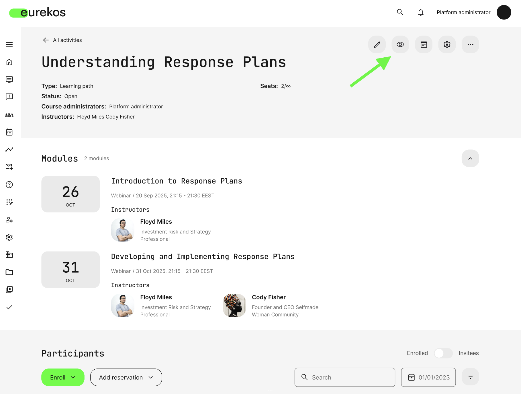 While previewing, you can open any of the modules contained in the learning path, including courses and course pages, events- and assignment pages, as well as nested training activities created through the existing training module type. Doing so will not generate progress, enrollment events or other analytics, allowing you to test thoroughly without skewing actual data or reports.