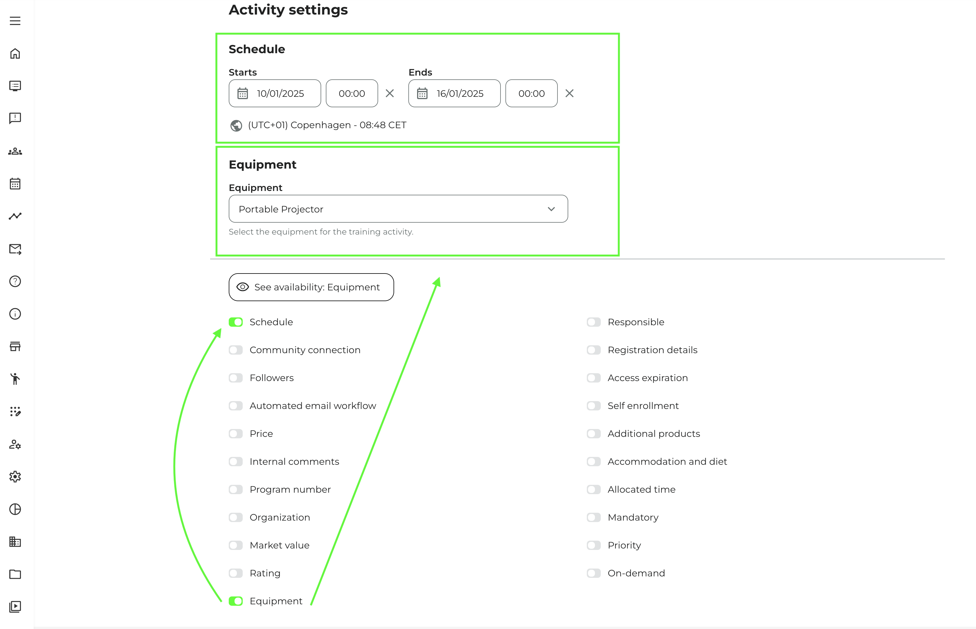 - For Event modules, equipment is available by default due to the mandatory built-in schedule.
