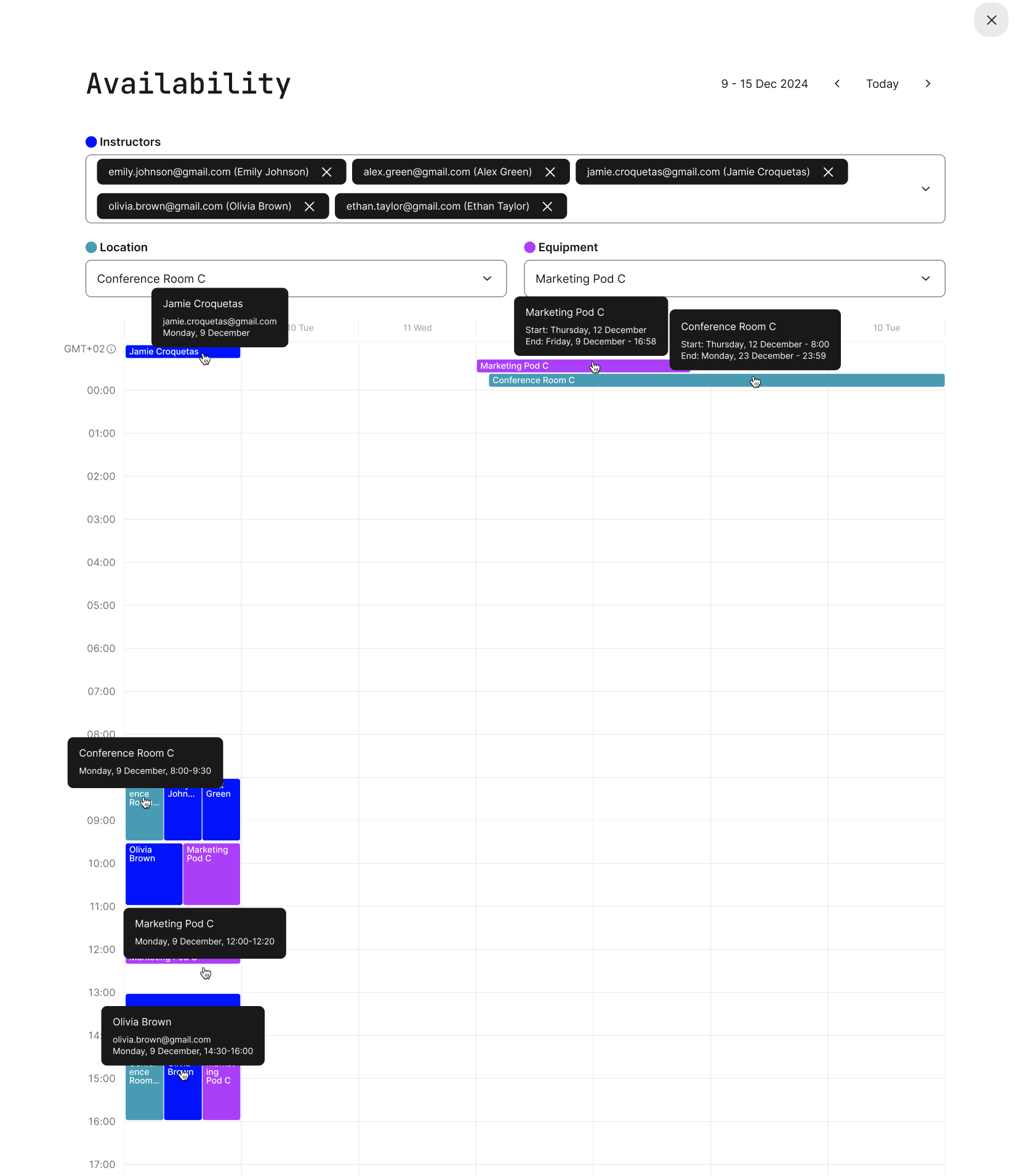 - Integrated Calendars: If the activity has a connected location or responsible instructor(s), their availability will also appear in the calendar overview.