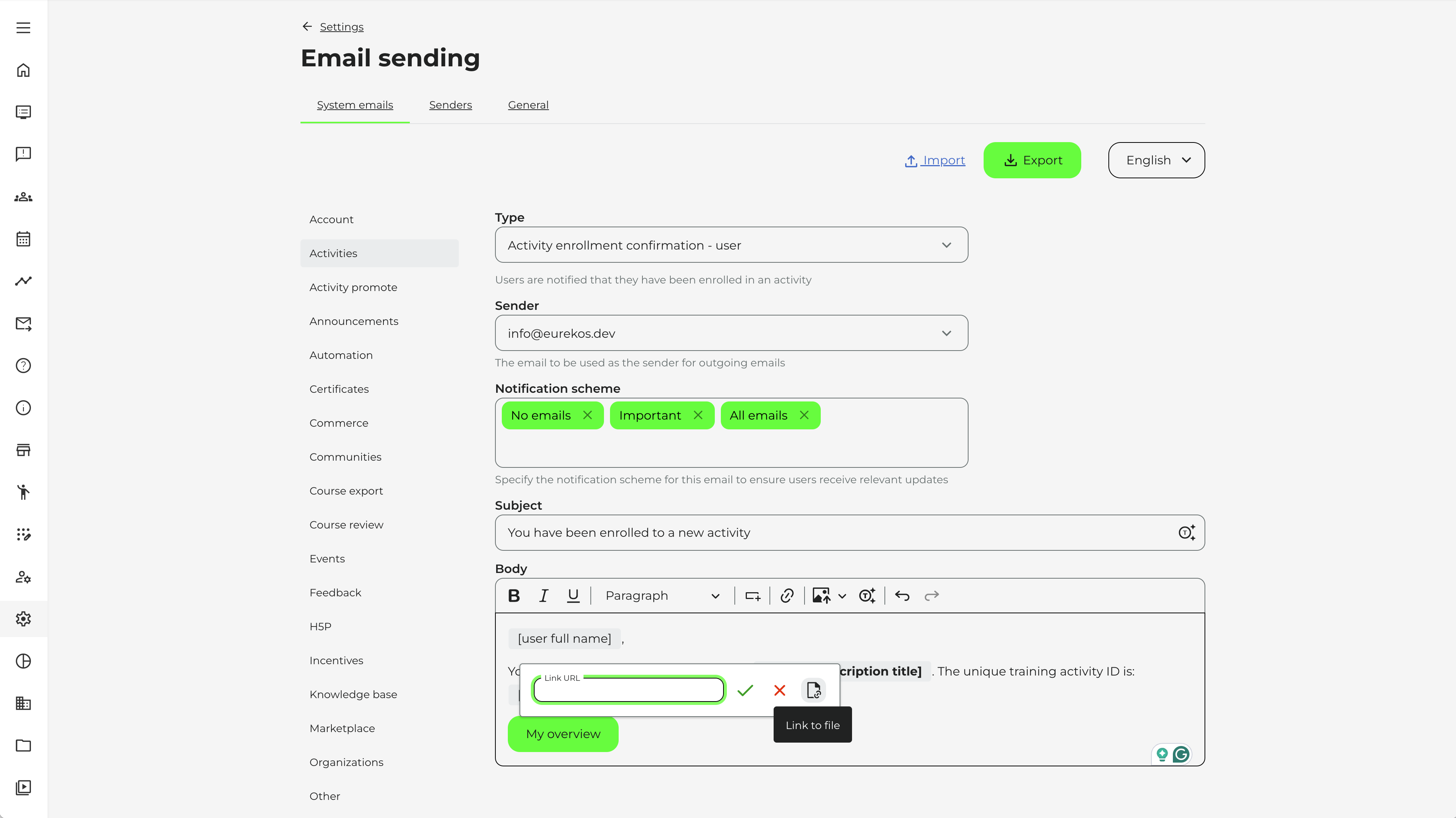 - System emails button plugin: The button plugin available in the body text of system emails (settings > email sending) now supports linking to a variety of tokens. This enhancement enables you to create buttons that direct users to their profile page, dashboard, course catalog, login page, and more, offering greater customization and user navigation options.