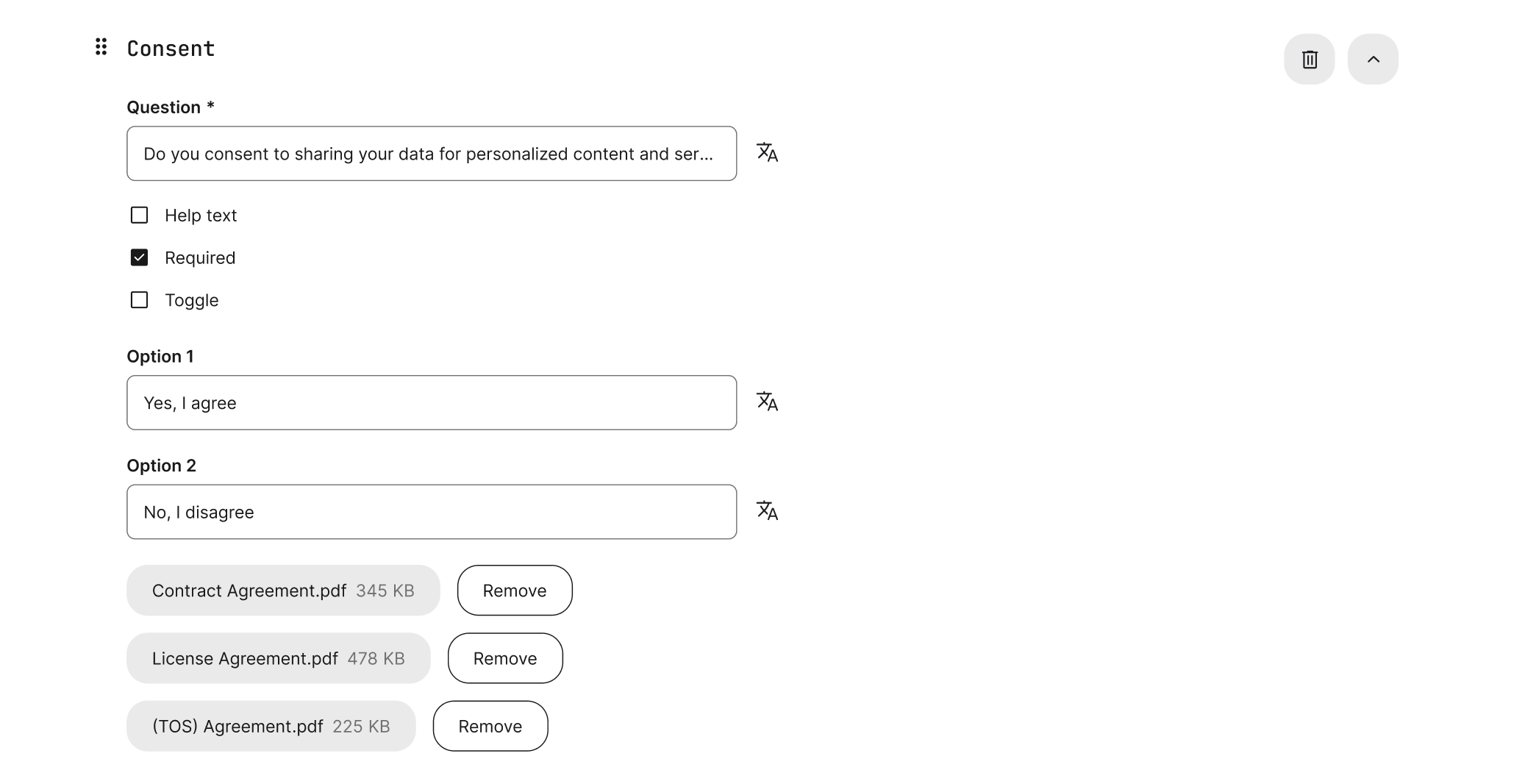 - New Consent Question Type in Questionnaires: Administrators can now add Consent questions to questionnaires, allowing users to provide agreement to legal terms or policies. These consents are securely stored on the user’s profile for easy access and audit.