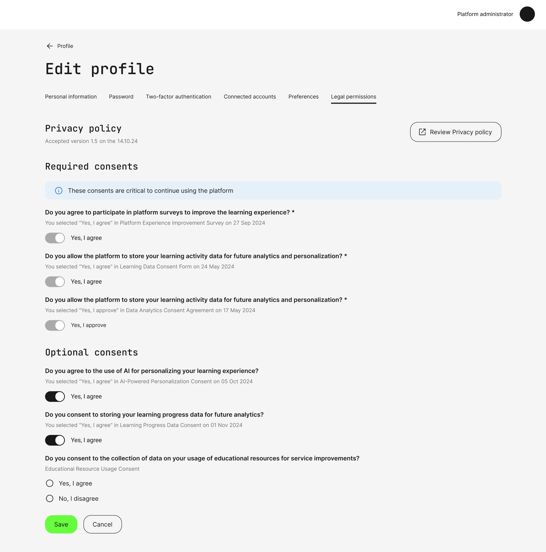 - Privacy Policy: If a platform privacy policy is in place, the latest version is displayed under the Legal Permissions tab with a timestamp of when it was accepted and a direct link for users to review it.