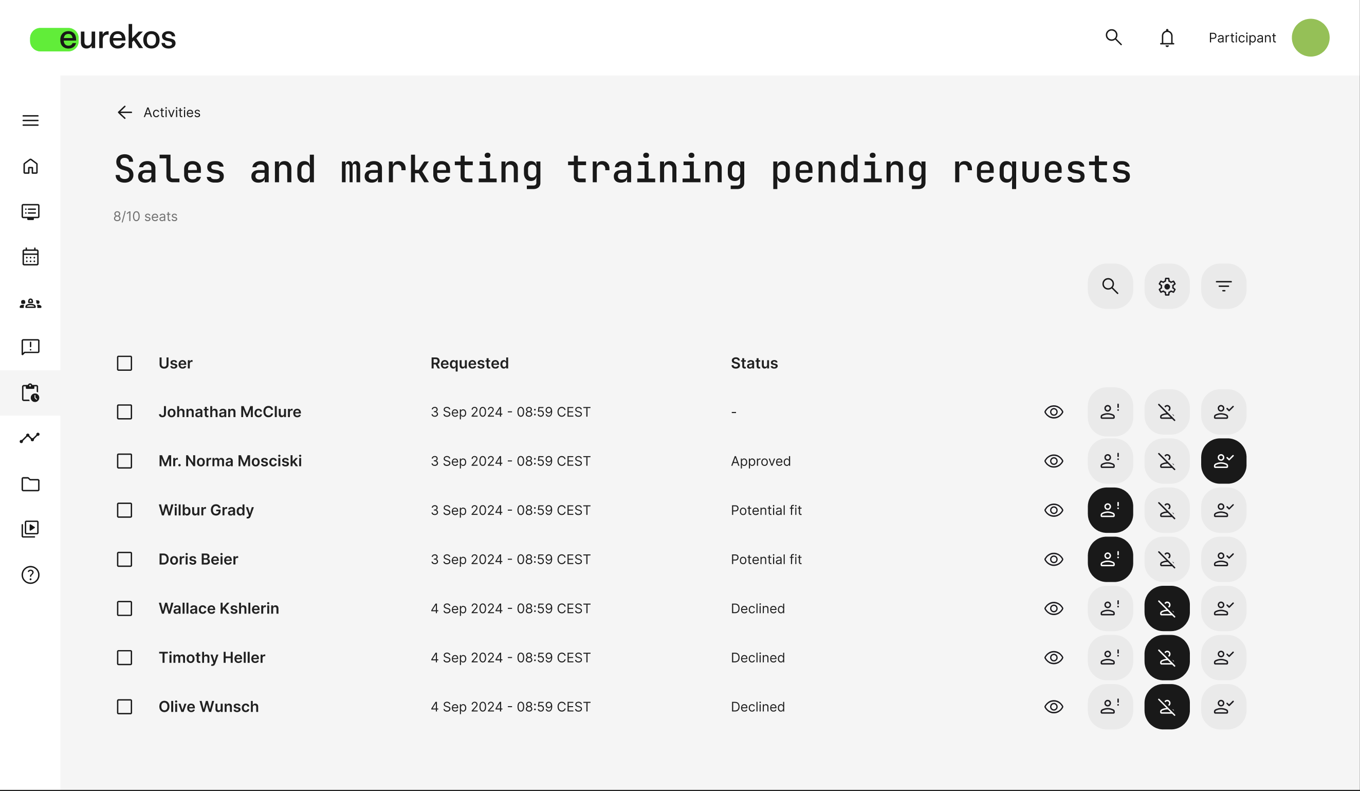 - A status column has been added to the participation approval list, showing the current status of each request: Pending, approved, or declined.
