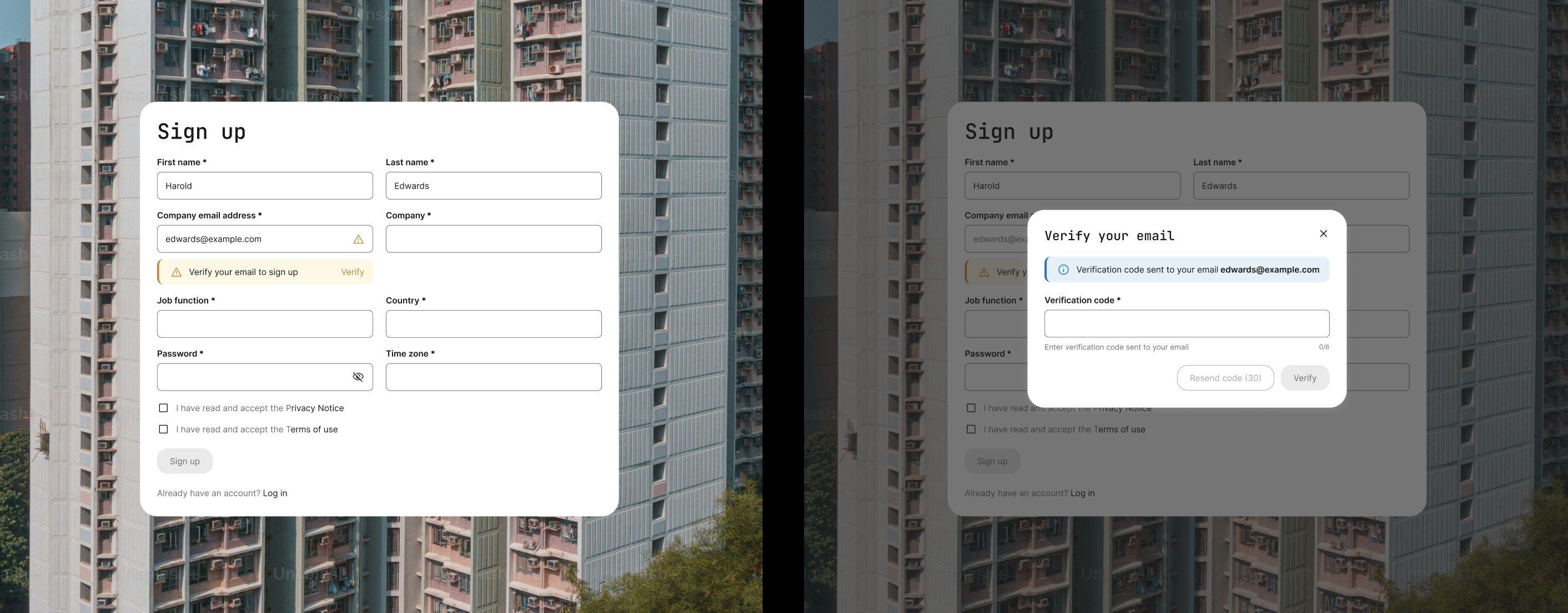 - In-form email verification: When the user has finished typing in their email, an information box will appear asking the user to verify their email. When they click the button, a pop-up screen opens up, allowing the user to verify their email directly on the signup form.