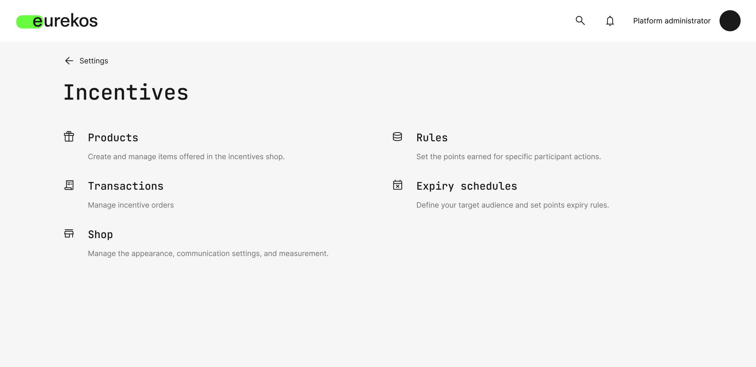 - Platform level: All roles with access to your platform settings can manage Incentives (e.g., adding products, configuring rules, and managing the shop). All users can earn and spend points and access the Incentives page, including the shop and leaderboard.